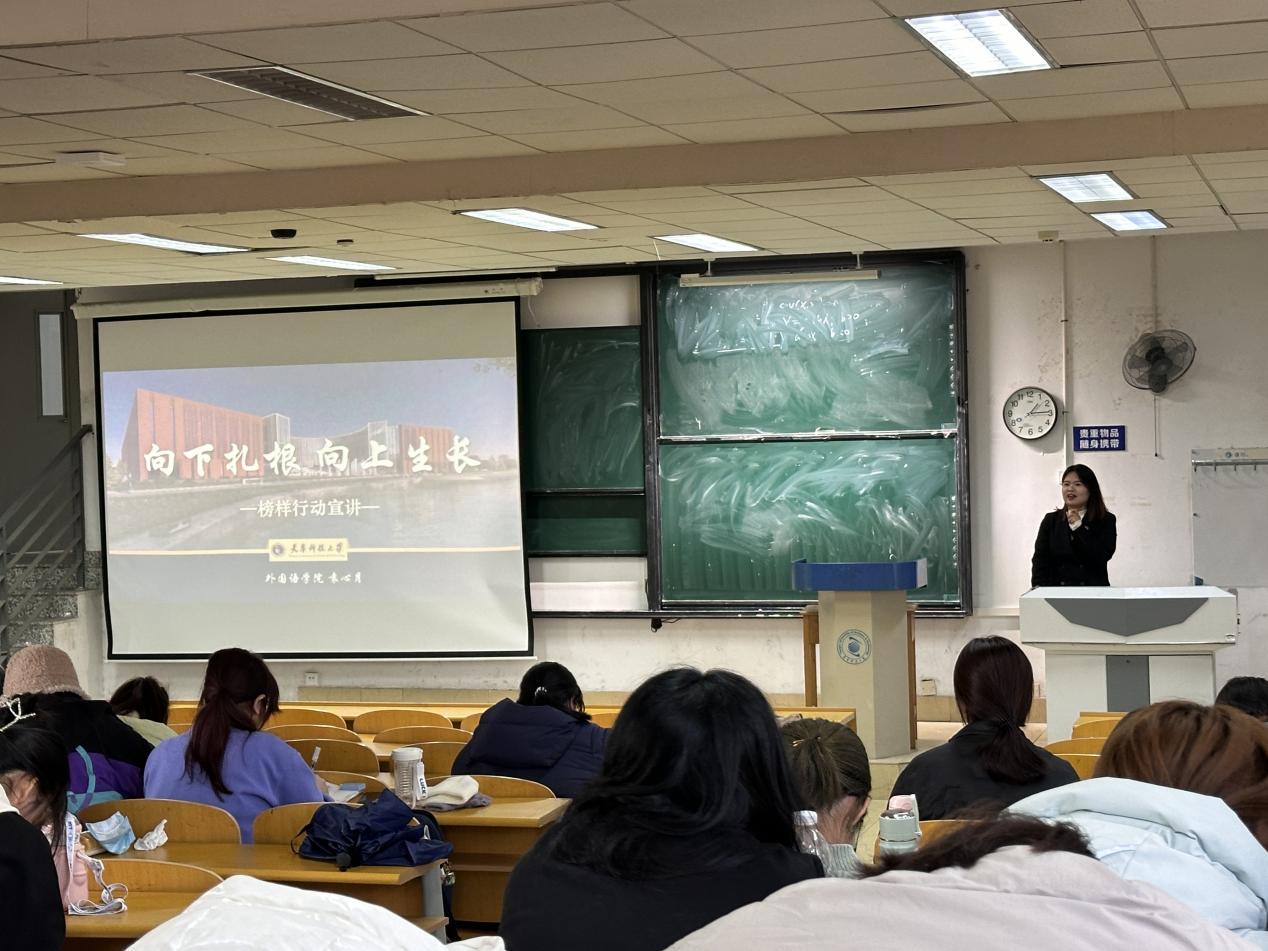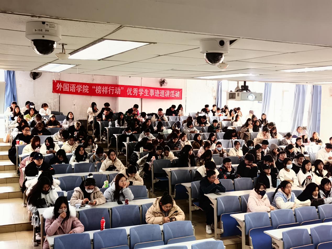 为深入学习贯彻习近平新时代中国特色社会主义思想,充分发挥先进典型示范引领作用,鼓励和引导广大同学学习和进步,外国语学院于2023年11月13日、14日分别在图书馆13阶梯、14阶梯开展了主题为“弘扬优良作风,踔厉奋发征程”的榜样行动优秀学生事迹巡讲活动,2022级、2023级全体学生参加。