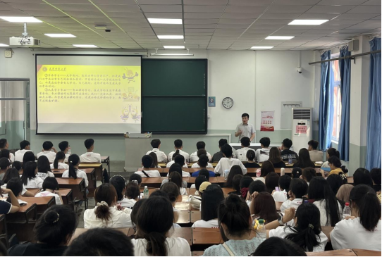 刘通老师对新生开展校规校纪和学业教育。他着重强调大学生应以学业为主,辅之以学生工作和文化活动,成为全方位发展的复合型人才。同时,他对学校规章制度、作息时间和课程学习作了细致讲解。特别提到了中学到大学教学方式和学习方法的变化,要从被动学习到主动学习,要逐渐养成自律的好习惯。并提醒同学们遵守校规校纪,以积极的心态面对大学生活。