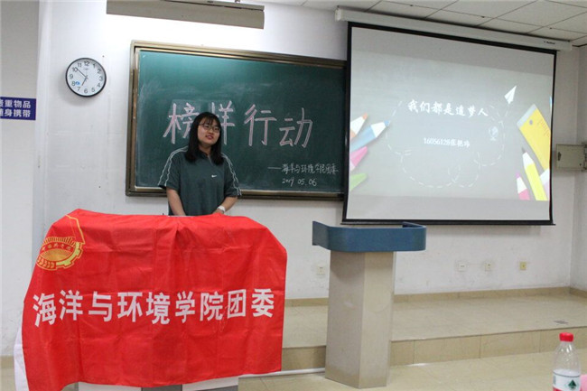 为增强榜样学生在大学生思想政治教育中坚定理想信念、传承五四精神、引领青春正能量,5月6日下午18:30,海洋与环境学院在泰达中校区5号楼213教室举行了第二场"榜样行动之优秀学生事迹巡讲"活动。此次活动由海洋与环境学院团委主办,院团委干事刘明龙主持,2017级全体同学到场参加。