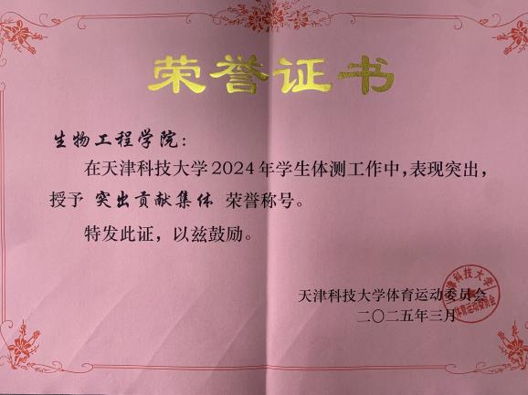生物工程学院在天津科技大学2024年体育节中通过全院师生的共同努力,凭借在多个项目中的优异成绩,获得“阳光体育先进集体”荣誉称号。在天津市国家学生体质健康标准测试抽测中高度重视,积极准备,获得“突出贡献集体”荣誉称号。这些荣誉称号是学院体育育人工作的生动实践,学院将进一步立足教育抓体育,让体育育人释放出更多活力与能量,让青年学生在体育锻炼中享受乐趣、增强体质、健全人格、锻炼意志,成为德智体美劳全面发展的社会主义建设者和接班人。