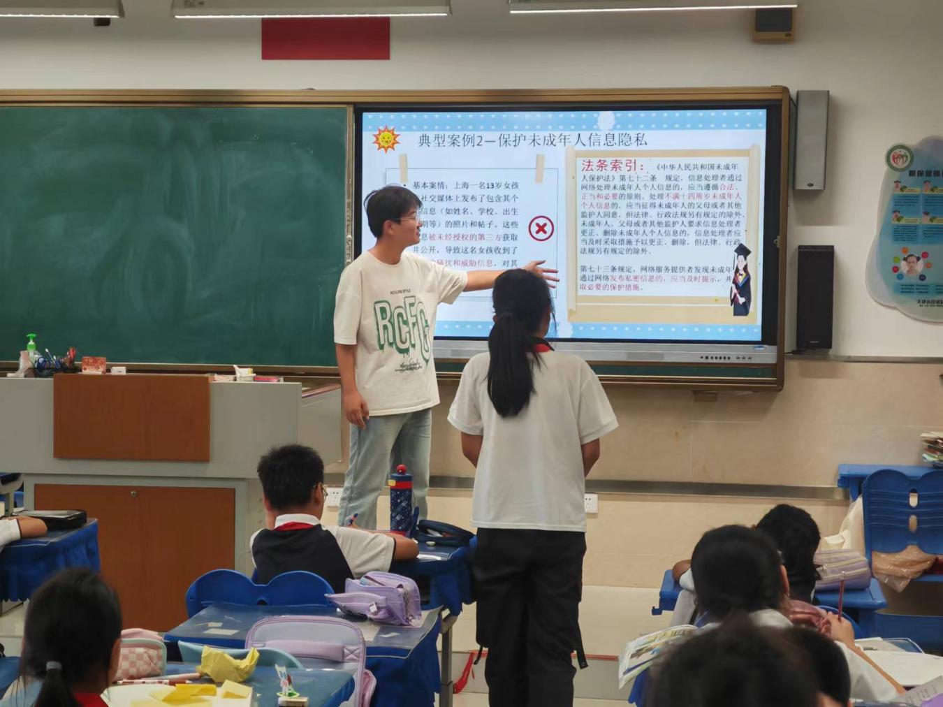 活动伊始,主讲人以法治视频为教材,深刻剖析网络诈骗、未成年人遗弃以及校园欺凌等典型案例,为学生们打开了解法律世界的窗户,教育引导学生提高防范意识,反对违法行为,做守法好少年。接下来,为鼓励同学们更好地应用法律知识,主讲人结合生活实际开展互动问答环节。问答内容精彩丰富,引起师生广泛共鸣,同学们纷纷表示将用法律武器维护自己的合法权益,做自己的安全小卫士。