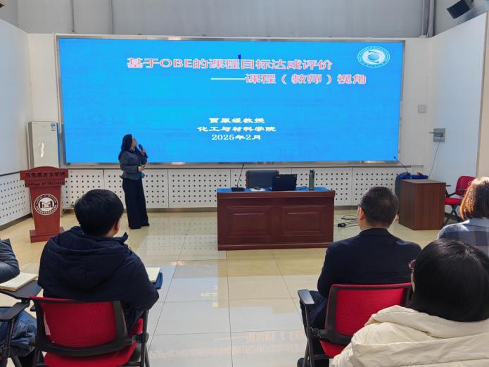 会上,贾原媛教授基于教师视角,从“OBE四问”切入,详细讲解了OBE教育理念的实施原则、实施要点,深入阐释了培养方案、毕业要求、课程目标之间的逻辑关系,并结合自己教授的化工原理课程和思政课程的特点,系统讲解了开展课程目标达成评价的思路方法。贾教授的培训理实结合、深入浅出,对学院老师更好地理解OBE教育理念和更科学地开展课程目标达成评价提供了重要指导。