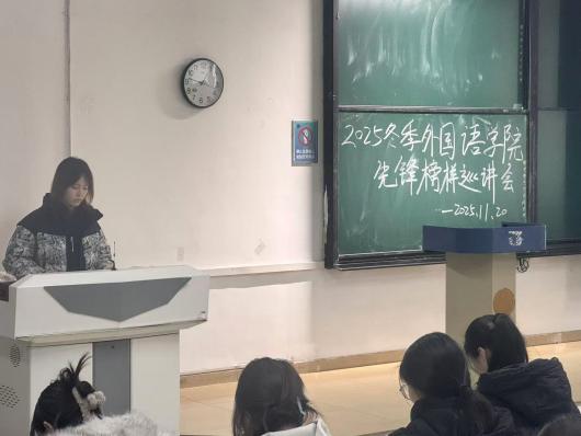 为充分发挥优秀学子的示范引领作用,帮助外院学子精准破解学业成长难题、科学规划校园生涯,学院举办“先锋榜样”巡讲会活动。11月20日中午,外国语学院于图书馆第12阶梯教室举办2025年度冬季先锋榜样巡讲会,本次巡讲会特邀金柏慧、李春丽、胡云、姜立衡、吴丽琪担任主讲嘉宾,巡讲覆盖2024级与2025级全体同学。本次巡讲围绕多维度成长核心领域,为低年级同学带来深度分享。