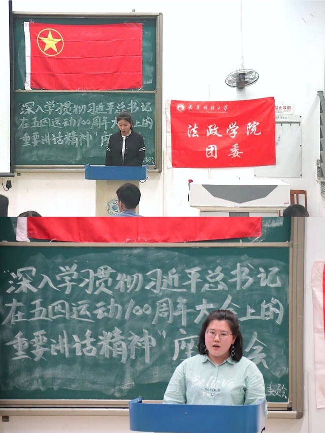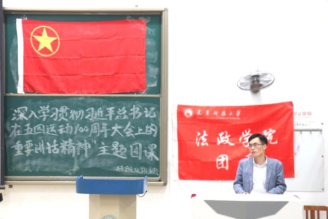 习近平总书记指出:青年是整个社会力量中最积极,最有生气的力量,国家的希望在青年,民族的未来在青年。为了鼓舞广大青年学子继承五四精神,做新时代的奋进者、开拓者、奉献者,2019年5月13日晚8:30分,法政学院团委于中院图书馆9-17阶梯教室举办了”深入学习贯彻习近平总书记在五四运动100周年大会上的重要讲话精神”主题团课。主讲人为法政学院团委书记、2018级辅导员穆庆夏老师。