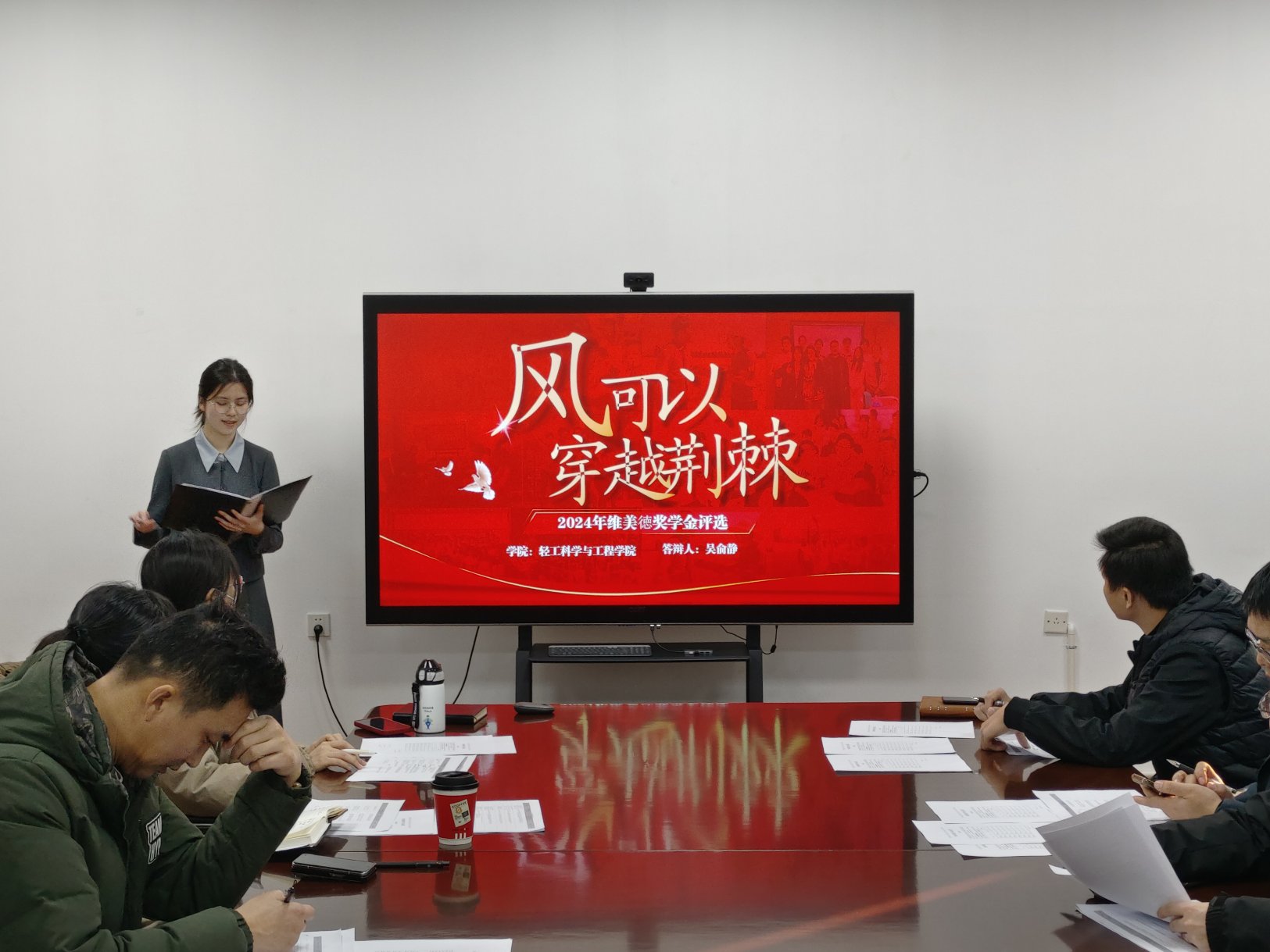 为深入推进落实“先锋计划”,积极推动“思政铸魂”行动计划见行见效,进一步加强校企合作交流,充分发挥优秀学生的示范引领作用,引领广大轻工学子积极争做先锋青年,12月24日,轻工科学与工程学院在滨海校区中院4-312会议室举行了2023-2024学年维美德奖学金评选大会。学院党委副书记、纪委书记蒋华朋,专业教师代表王高升、王冠华、安兴业、刘海棠,辅导员代表王严、宋东辉、安园园以及学生代表出席大会并担任评委。