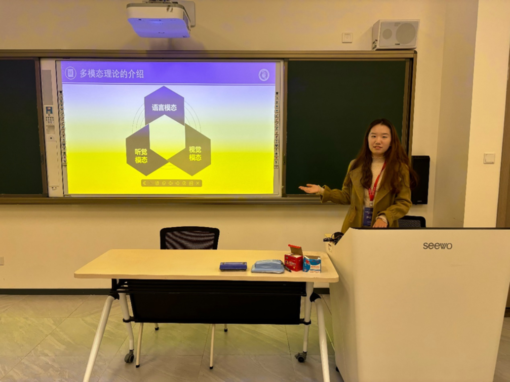 研讨会中,在“表达驱动”教学实践与案例分析主题分会场,郭建凤同学报告了论文《基于多模态理论的对外汉语书法文化体验课程设计——以泰国易三仓大学来华学生为例》,该论文在顾毅教授的指导下完成。论文以“汉语桥”泰国来华留学生项目的教学实践为基础,探究了多模态理论在教学实际中的应用。认为通过图片模版的使用,可以把泰国学生觉得抽象的书法概念,图文并茂地展现出来。课程演示也是一种表达,通过演示输入和言语输入,选择合适的输入内容,老师和学生可以在课堂中进行充分地互动,学生在课下可以选择性进行输出表达,实现对语言和文化的学习。在语言模态的选择上要参照学生的背景既要以中文为主,又可以配合使用英语,泰语。视频模态和听觉模态的选择上要相互勾连,视频既要注意视角选择还要注意语言的使用。相较于单模态,多模态之间的互通更有利于形成一节有效的书法文化体验课。在此基础上应用多模态时还要考虑学生的志趣爱好,以及文化的相似差异,可以让学生在短时间内了解书法的魅力,实现学生持续性学习。