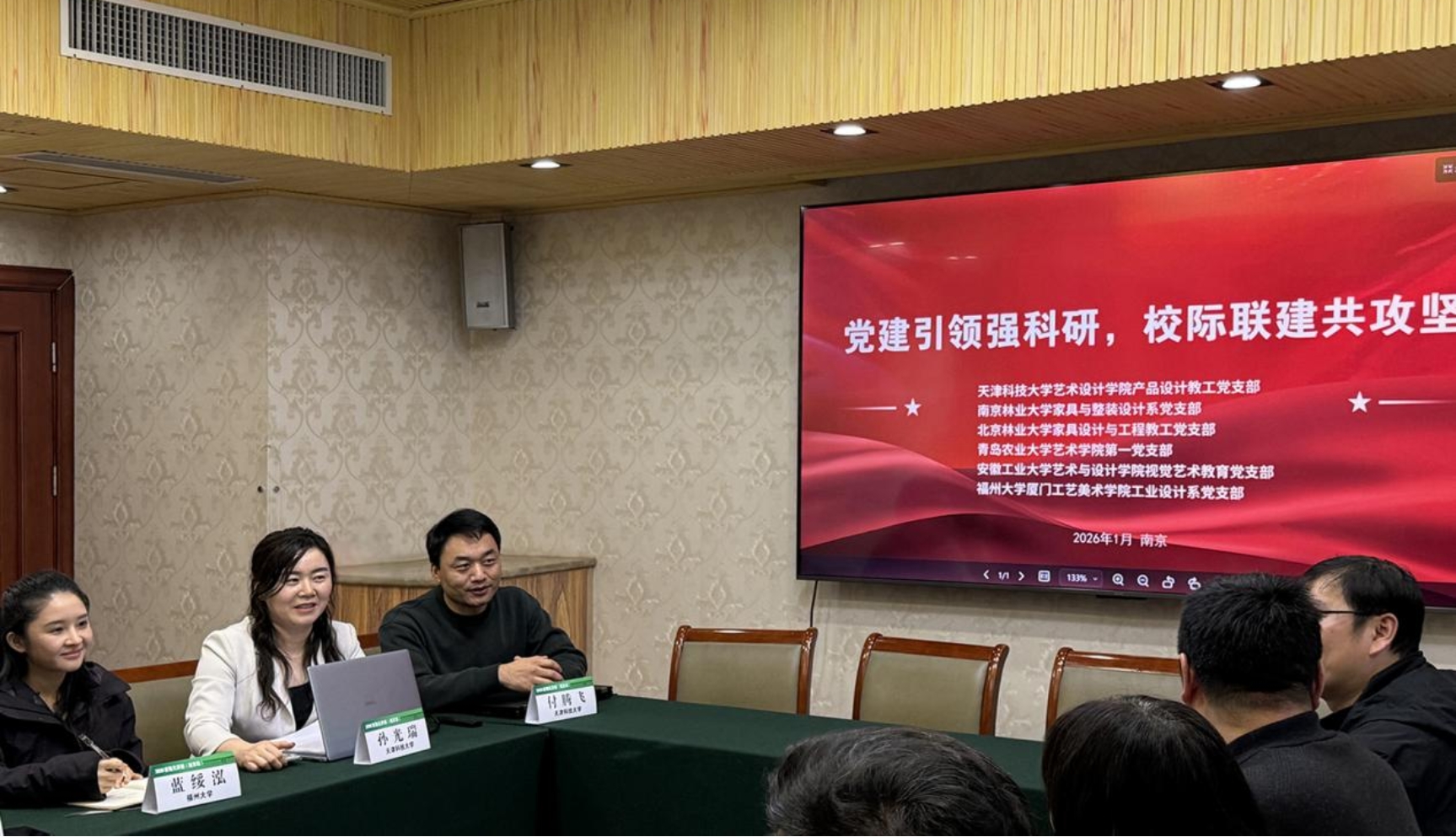 为深入学习贯彻习近平新时代中国特色社会主义思想及党的二十大和二十届历次全会精神,深学深用习近平总书记视察天津重要讲话精神,近日,由天津科技大学艺术设计学院产品设计教工党支部牵头的校际党建联建交流会在南京林业大学南林大厦召开。天津科技大学、南京林业大学、北京林业大学、青岛农业大学、安徽工业大学、福州大学厦门工艺美术学院六所高校的相关党支部书记及党员代表齐聚一堂,以党建为纽带,聚焦“一融双高”建设要求,共商科研、育人、学科建设协同发展新路径。