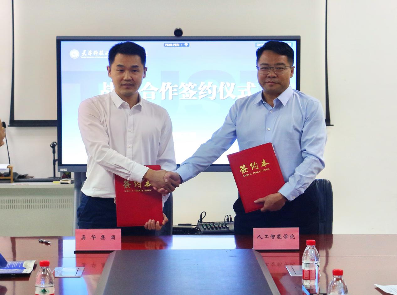 10月16日下午,天津科技大学人工智能学院与天津市嘉华城市建设发展集团有限公司全面战略合作签约仪式在天津科技大学滨海校区举行,双方就推动教育、科技、产业优势资源共享,实现校企间人才联合培养、科技人才互聘兼职、科技项目联合攻关、科研支撑平台共享等签署战略合作协议。嘉华集团党委书记、董事长杨凯钧,党委副书记阎蕾,纪委书记王春青,副经理石远,党群工作部部长张阳,综合办公室部长彭婷婷;人工智能学院党委书记司占军,党委副书记、院长张贤坤,党委副书记、纪委书记韩静,副院长杨硕,智能科学系主任张传雷,智能科学系副教授范海峰以及中轻天科(天津)生物技术有限公司总经理孙根元出席签约仪式,会议由副院长杨硕主持。