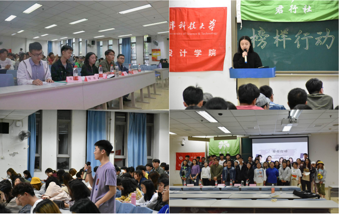 为了进一步发挥榜样的示范引领作用,引导学生向优秀学长学习,5月5日晚,艺术设计学院在9号楼3阶梯教室举行“榜样行动”优秀学生事迹巡讲活动。艺术学院18级辅导员易晓俊老师,校级巡讲团成员海洋与环境学院海洋技术张龙威、产品设计专业田原源、产品设计专业师维、环境设计专业李金鹏及2017、2018级学生参加本次活动。