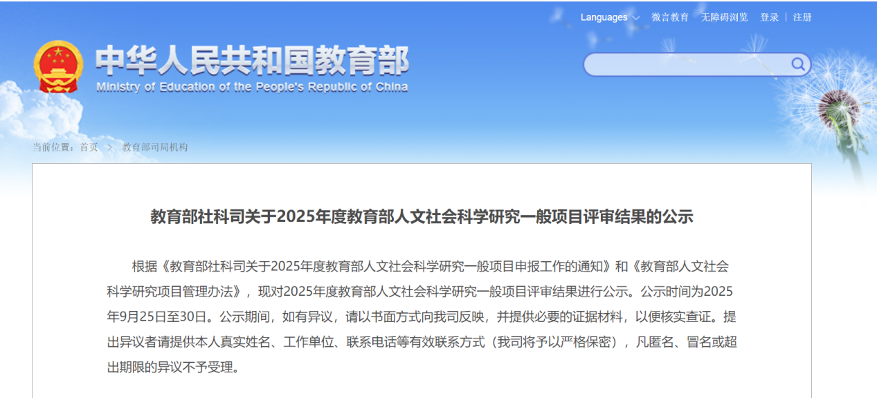 近日,教育部社会科学司正式发布2025年度教育部人文社会科学研究一般项目评审结果公示。我院在此次评审中首次同时获批两项青年基金项目,实现纵向科研立项领域的突破性进展!