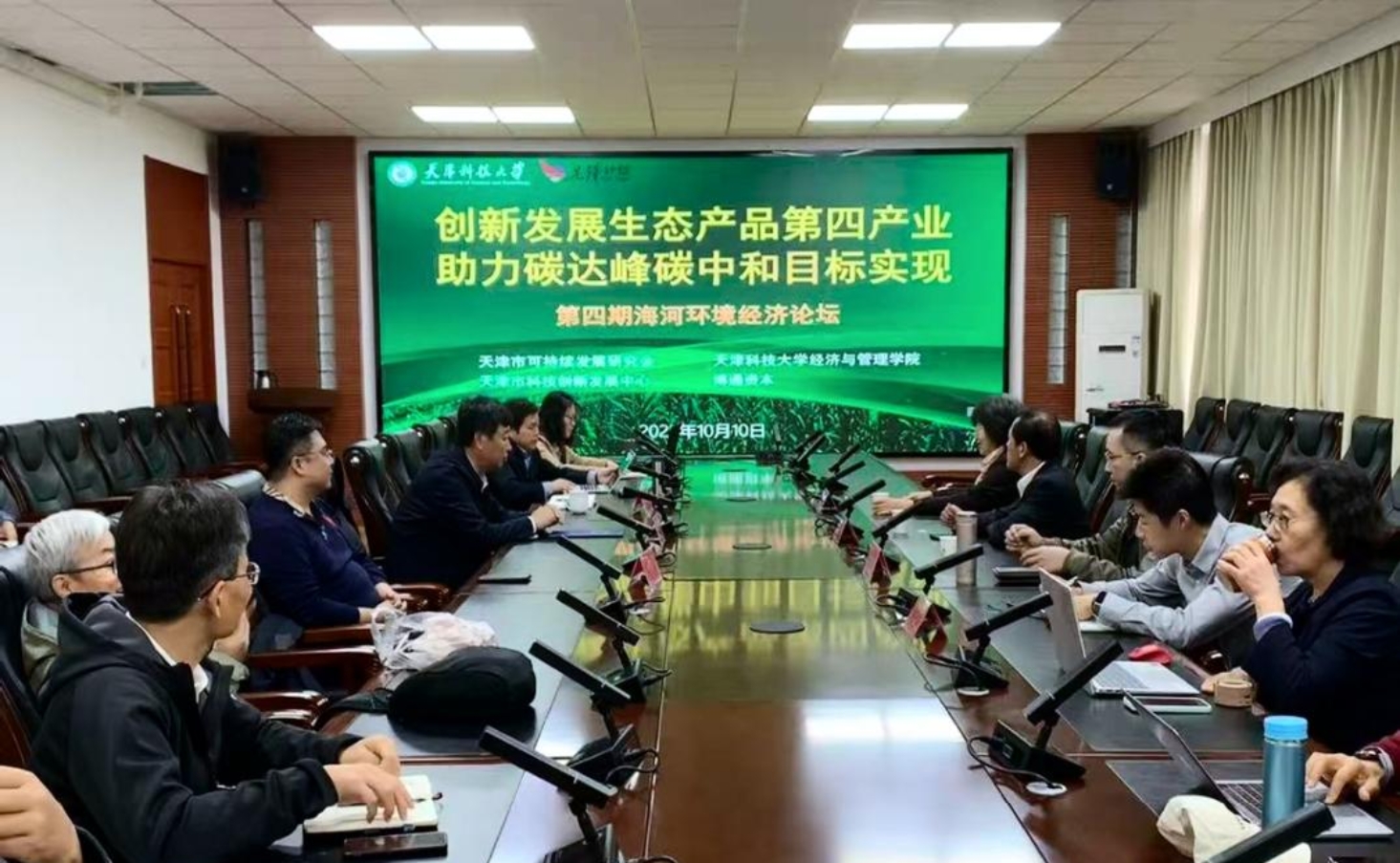10月10日,第四期“海河环境经济论坛”在天津科技大学经济与管理学院顺利举行。天津市可持续发展研究会杨超英书记,辽宁大学经济学院院长李政教授,博通资本董事长李小平,天津市科技创新发展中心科技金融部副部长刘东岳,天津科技大学海河科创学院(新质生产力研究中心)院长华欣教授,天津科技大学艺术与设计学院院长张志宇教授,天津科技大学经济与管理学院院长宋有涛教授,副院长朱建民、于丽艳以及十余位经济与管理学院师生参加了论坛,共话绿色发展与“双碳”目标下的路径探索。