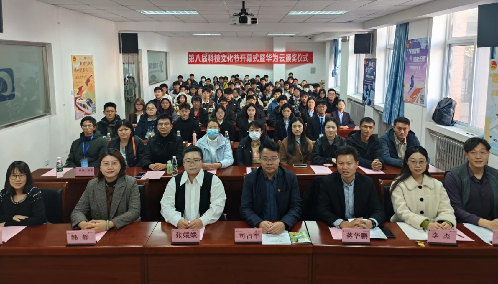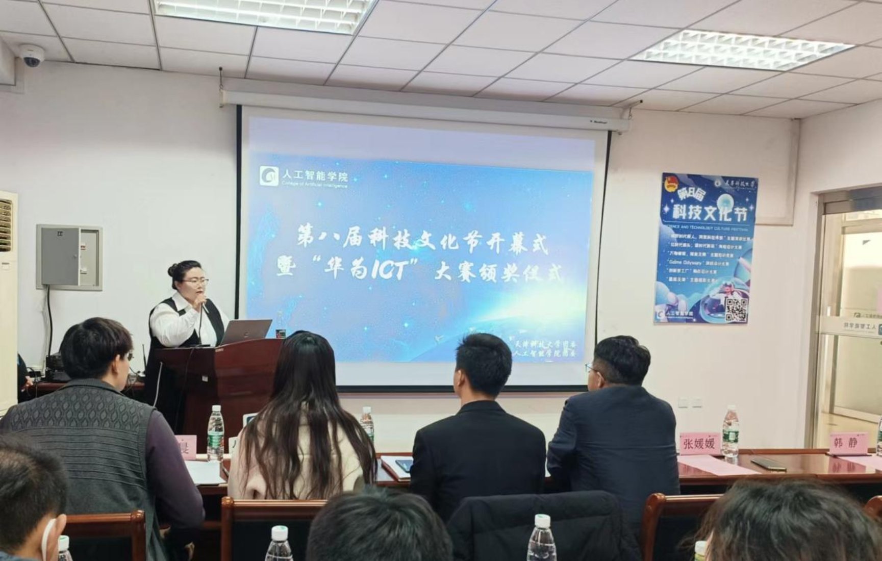 为激励青年学生科技报国,培养青年学生锐意进取、勇于攻坚克难的意志品质,营造学校及学院良好的学术科技氛围。11月17日,由天津科技大学团委主办,人工智能学院承办的第八届科技文化节开幕式暨“华为ICT大赛”颁奖仪式在滨海西校区八号楼103举行。人工智能学院党委书记司占军、天津科技大学团委副书记蒋华朋、职联科技(天津)有限公司副总经理张媛媛、人工智能学院党委副书记、纪委书记韩静、人工智能学院创新创业实践中心主任王嫄、人工智能学院团委书记兼学生工作办公室主任邓雪晨、教师代表和各年级辅导员、学生代表们参加了此次开幕式。
