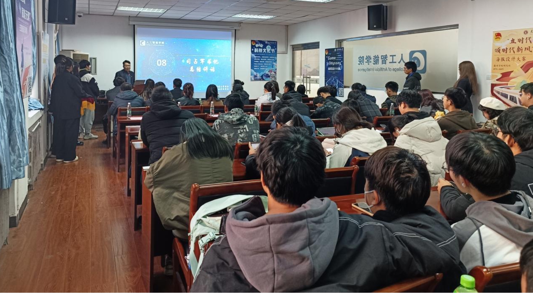 最后,院党委书记司占军对本次会议进行总结。司书记先是对我院举办的科技文化节系列活动给予肯定与支持,对包括华为在内的优秀企业表示由衷感谢,并希望在第八届科技文化节中,人工智能学院的师生在科技创新、创意实践等方面勇于挑战,努力实现“智慧科技引领未来”的使命目标。讲话内容中,司书记对同学们提出了几点要求:一是积极应对挑战,担当使命;二是善于学习,勇于实践;三是锤炼品德修为,引领新风,在这些要求中寄托了他对同学们的深切厚望。
