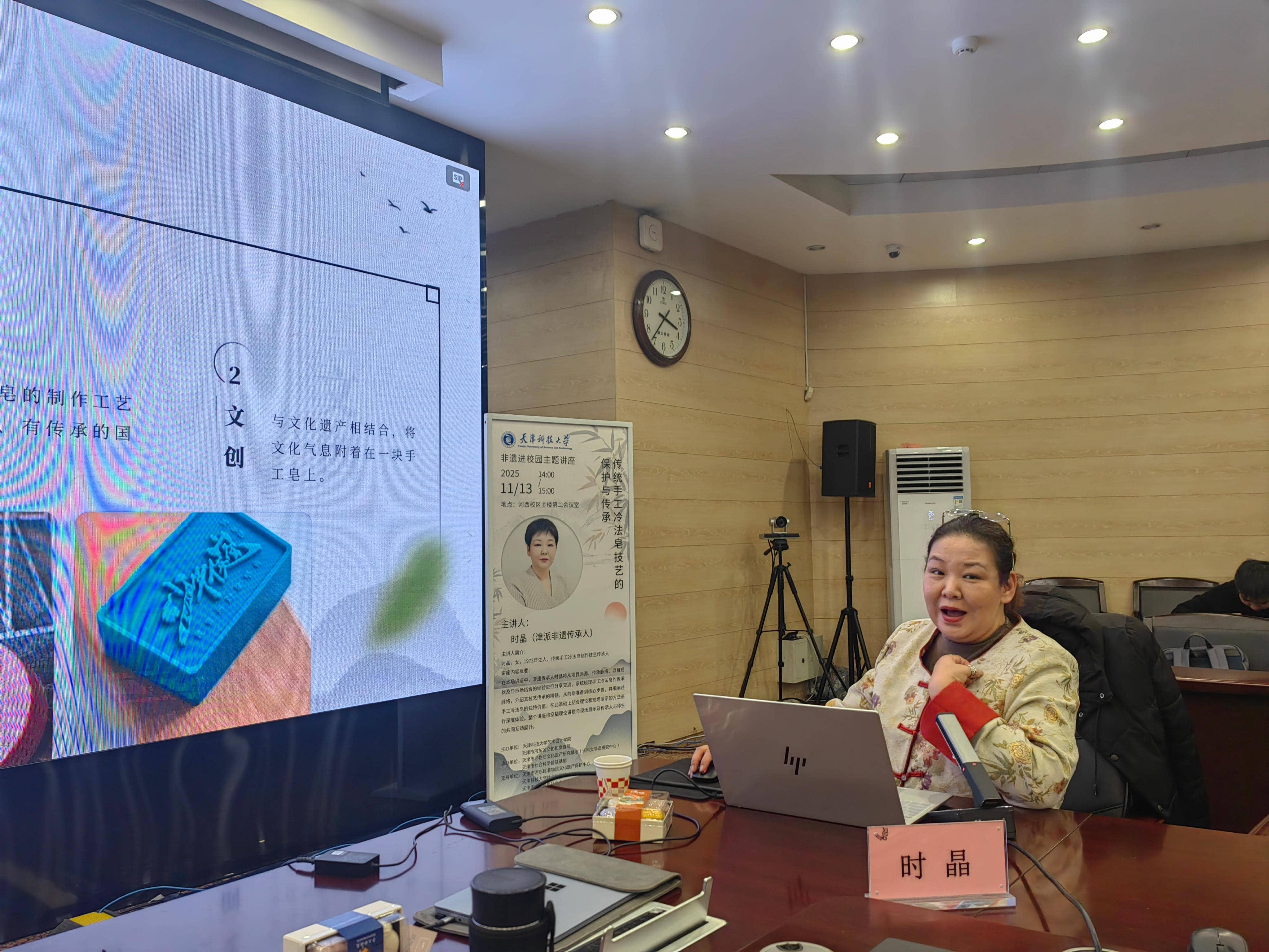随后,手工冷法皂技艺非遗传承人时晶老师带来了精彩的手工冷法皂技艺分享。开场便向同学们展示了多款造型精美、香气宜人的手工皂,瞬间吸引了大家的注意力。