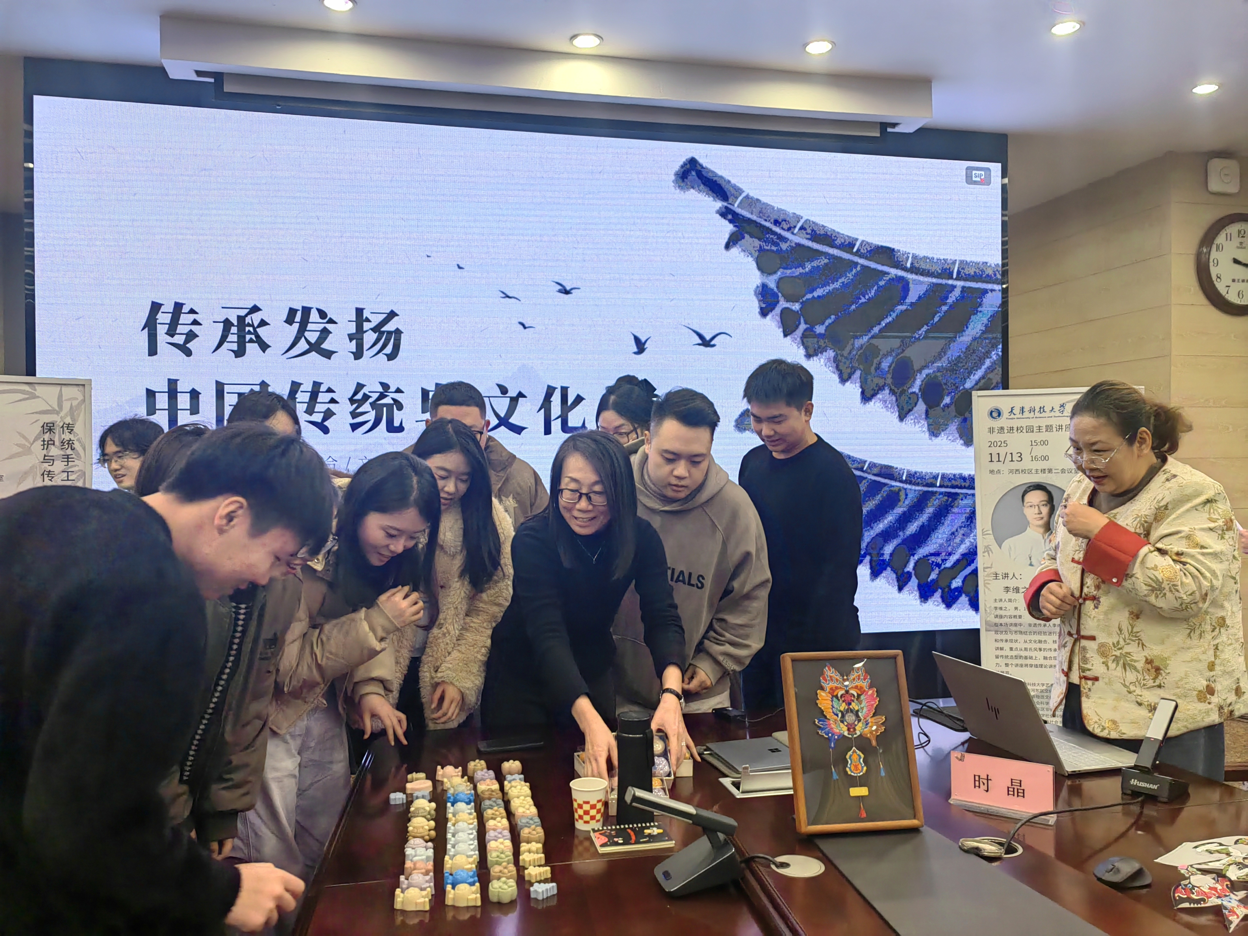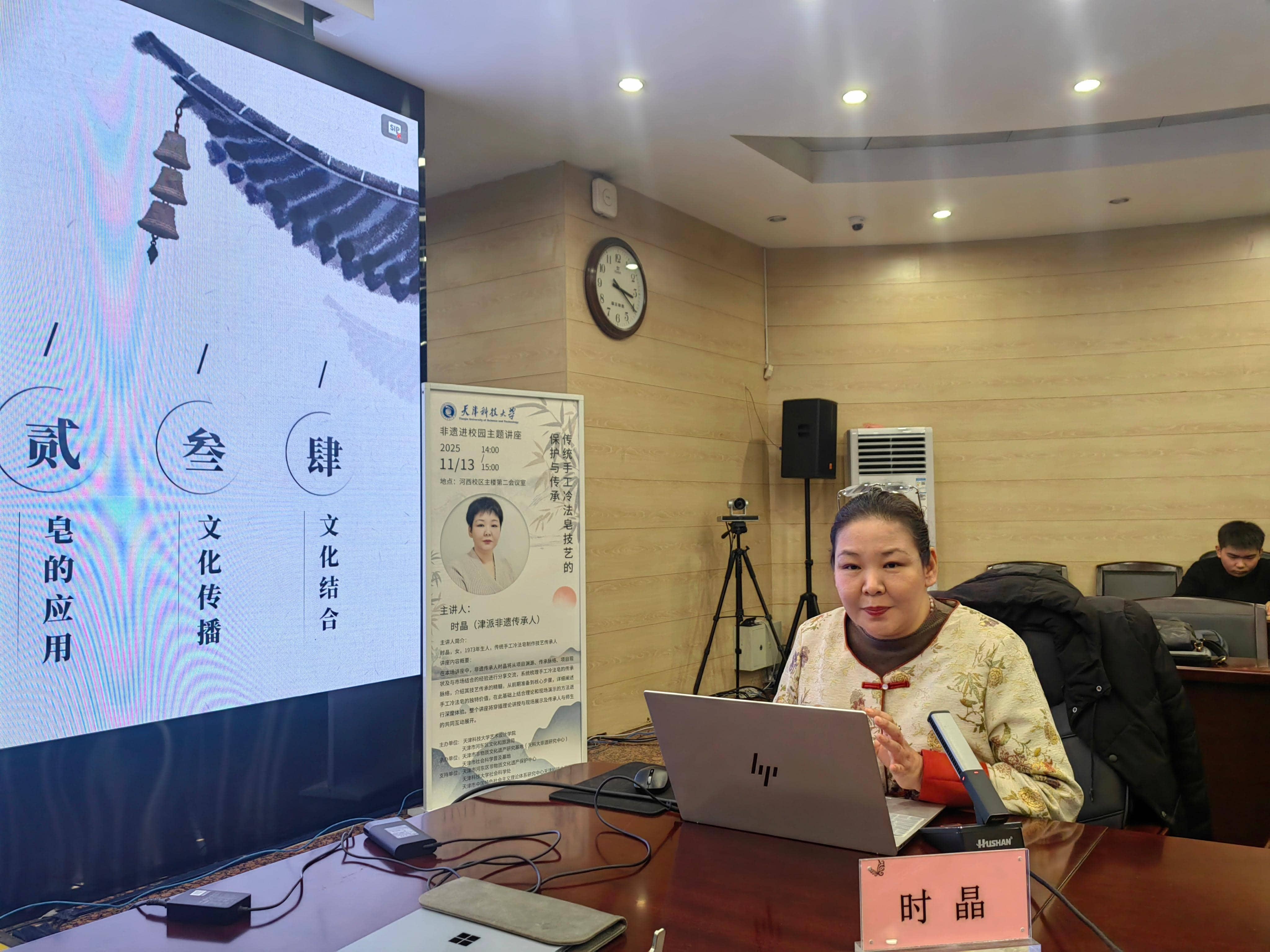 为传承中华优秀传统文化,感受津派非遗的独特魅力,11月13日下午,艺术设计学院开展“非遗进校园”主题活动,邀请津派风筝传承人李维之、手工冷法皂技艺传承人时晶走进天津科技大学河西校区开展专题讲座与交流,给与会师生带来了一场别开生面的文化盛宴。讲座由艺术设计学院副院长张新沂主持,天津市河东区非物质文化遗产保护中心主任刘允平、艺术设计学院党委书记朱丽丽、纪委书记包慧珂、副院长王伟静等领导出席,在河东区文化和旅游局挂职的动画系副教授武继贤老师以及学院2025级研究生共50余人参与本次活动。
