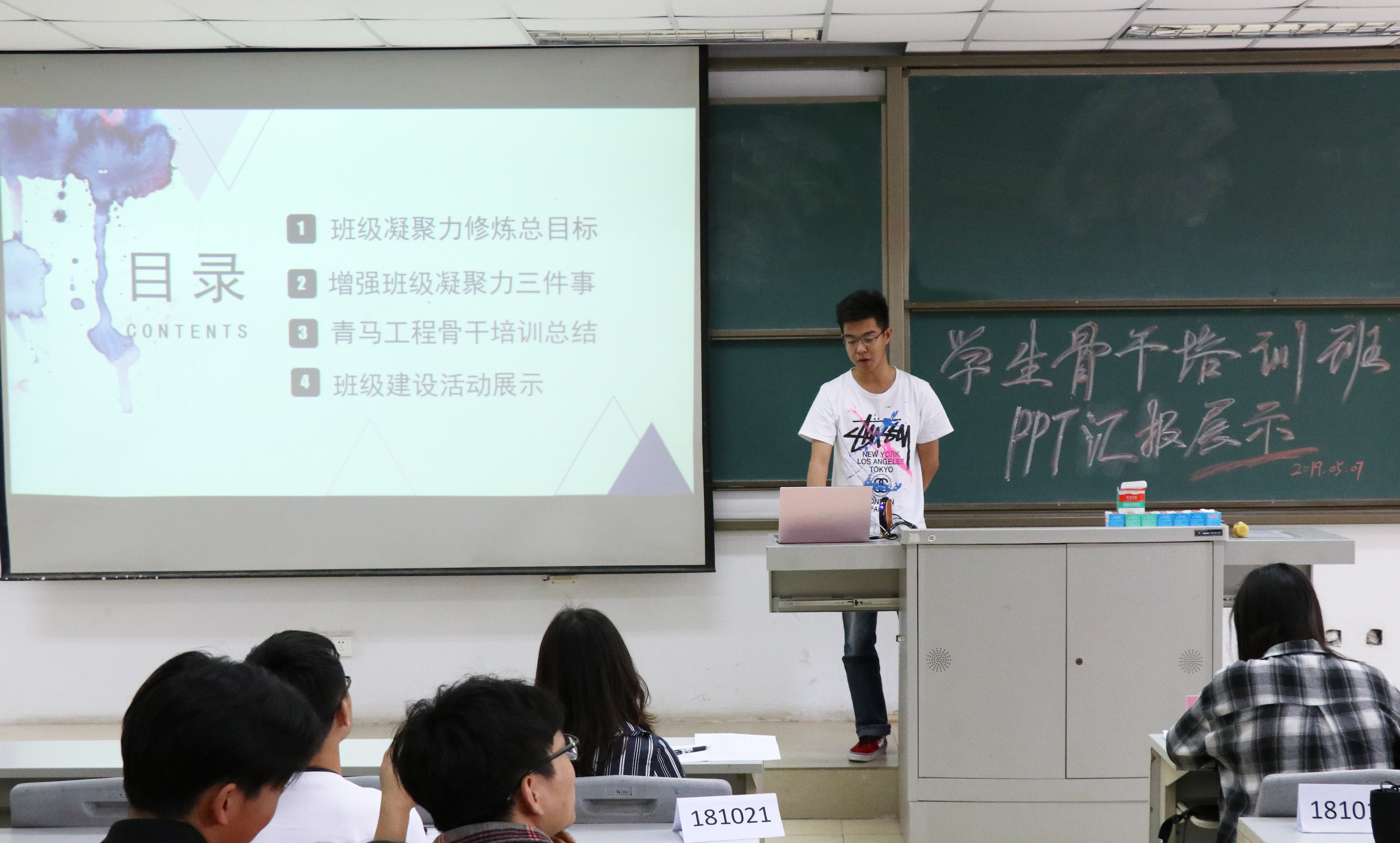 为培养优秀、负责的大学生骨干,提高学生骨干思想站位和工作能力。计算机学院团委于2019年5月7、8日于8号楼举办了院青马工程之学生骨干培训班级汇报总结评比活动。2018级辅导员袁锟、秦锋斌老师以及18级成长顾问担任此次活动的评委,2018级全体学生骨干参加。