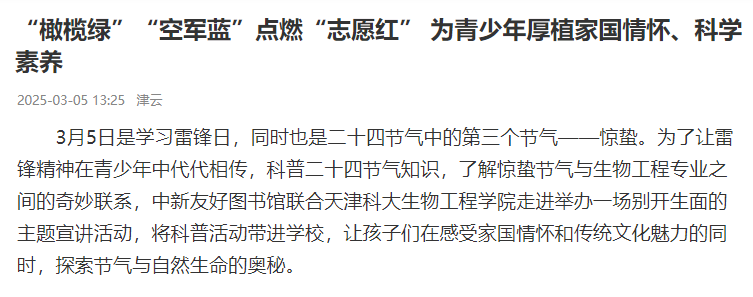 以下内容是生物工程学院学习雷锋日、惊蛰节气日主题活动,被《学习强国》、《津云》、《津滨海》等主流媒体宣传报道情况。