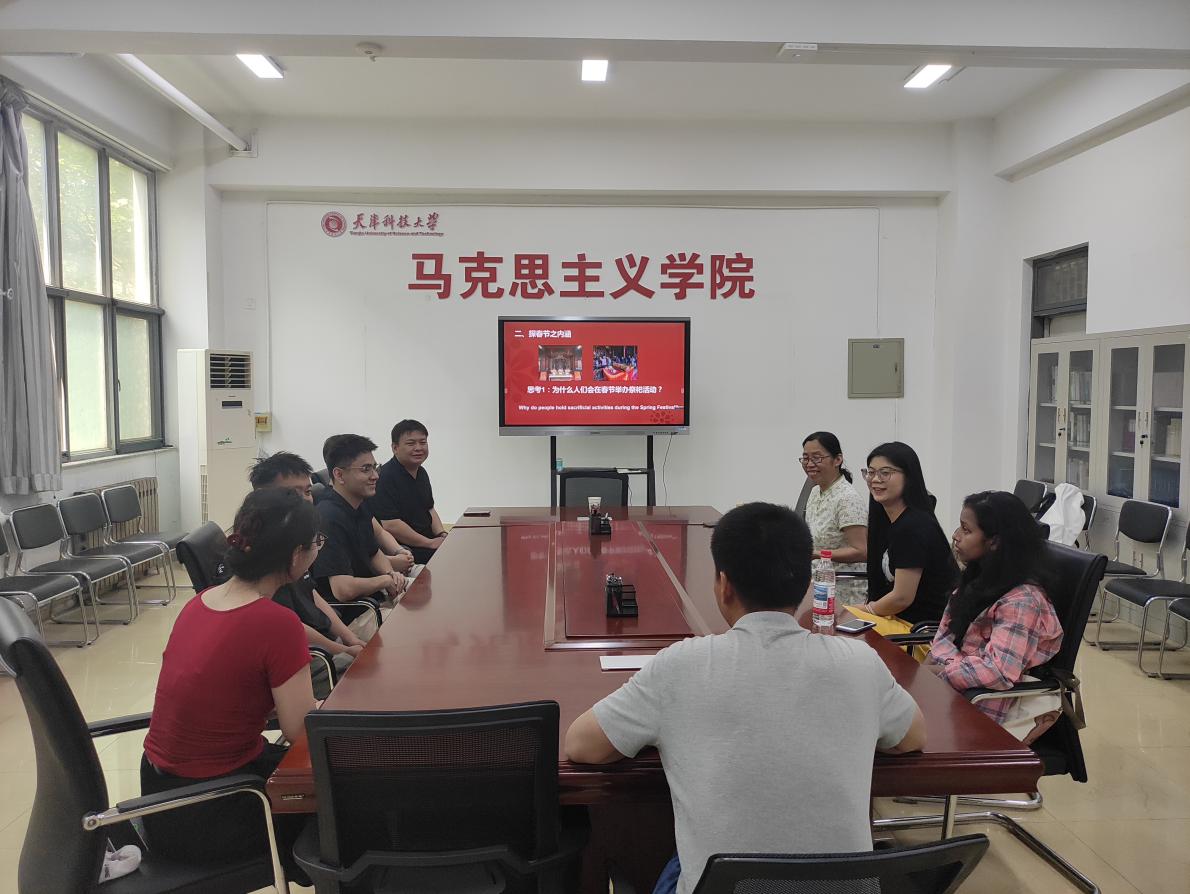 为深入贯彻关于加强和改进国际传播工作的重要精神,增进中外文化交流互鉴,提升中华文化影响力,马克思主义学院于6月12日在滨海校区举办了“中国的春节”主题文化交流活动。活动特邀学院教师赵志勇担任主讲嘉宾。学院副院长闫金奎、办公室主任陈伟出席活动。来自滨海校区生物工程学院的留学生代表以及马克思主义学院部分研究生代表共同参与了此次活动。