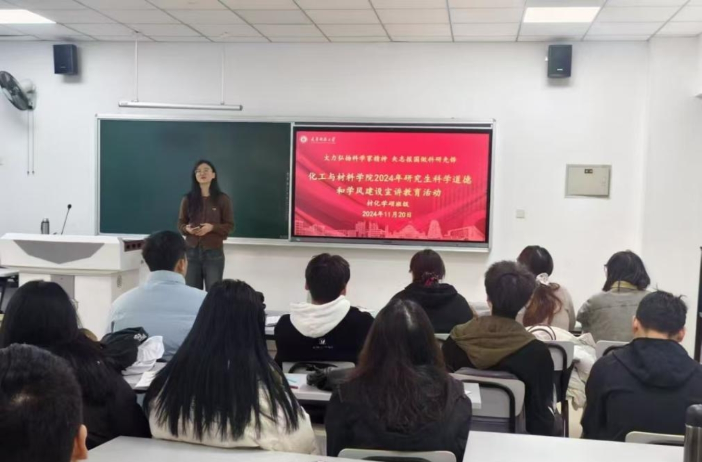 2024级化工专硕3班于11月19日晚在9-2阶梯教室组织开展了“研究生科学道德与学风建设”主题班会。班长宋佳乐结合《关于在科研活动中规范使用人工智能技术的诚信提醒》、《高等学校预防与处理学术不端行为办法》、《学位论文作假行为处理办法》等文件,通过详实的解读与生动的案例分析,提醒大家要以过往的学术不端事件为镜鉴,警醒自我,为同学们心中播下了科研诚信的种子,引导大家树立了正确的科研价值观与道德观。