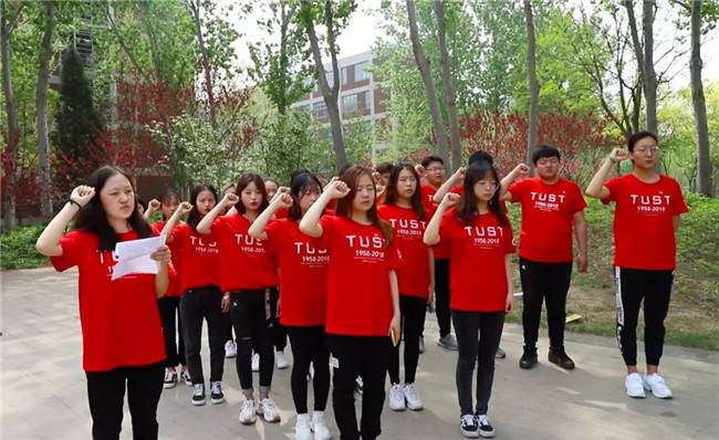 活动伊始同学们集合于天津科技大学泰达校区校训石旁,由桑贤哲同学对此次活动进行主持。本次活动共五个环节。首先是班长桑贤哲和团支书周蔚为同学们介绍此次活动的背景、开展的意义并对团支部成员送上寄语,全体同学齐唱国歌。在庄严的团旗下,优秀团员代表段清莹同学做演讲,指出当代青年要弘扬和传承五四精神,为民族复兴而奋斗。活动第三项,同学们重温入团誓词,全体同学齐唱团歌。这让同学们不禁回想起当初在团旗下庄严宣誓的那一刻。团委书记霍士磊老师为此次活动进行总结并对各位团员送出寄语。最后是主题朗诵环节,170804班每位同学都参与了此次主题朗诵并录制了视频。同学们热情高涨、兴致勃勃,此次朗诵及拍摄进行的十分圆满、顺利。