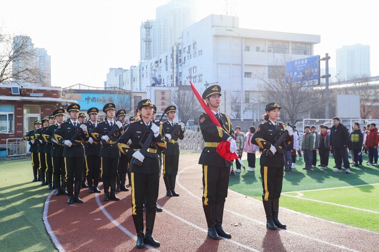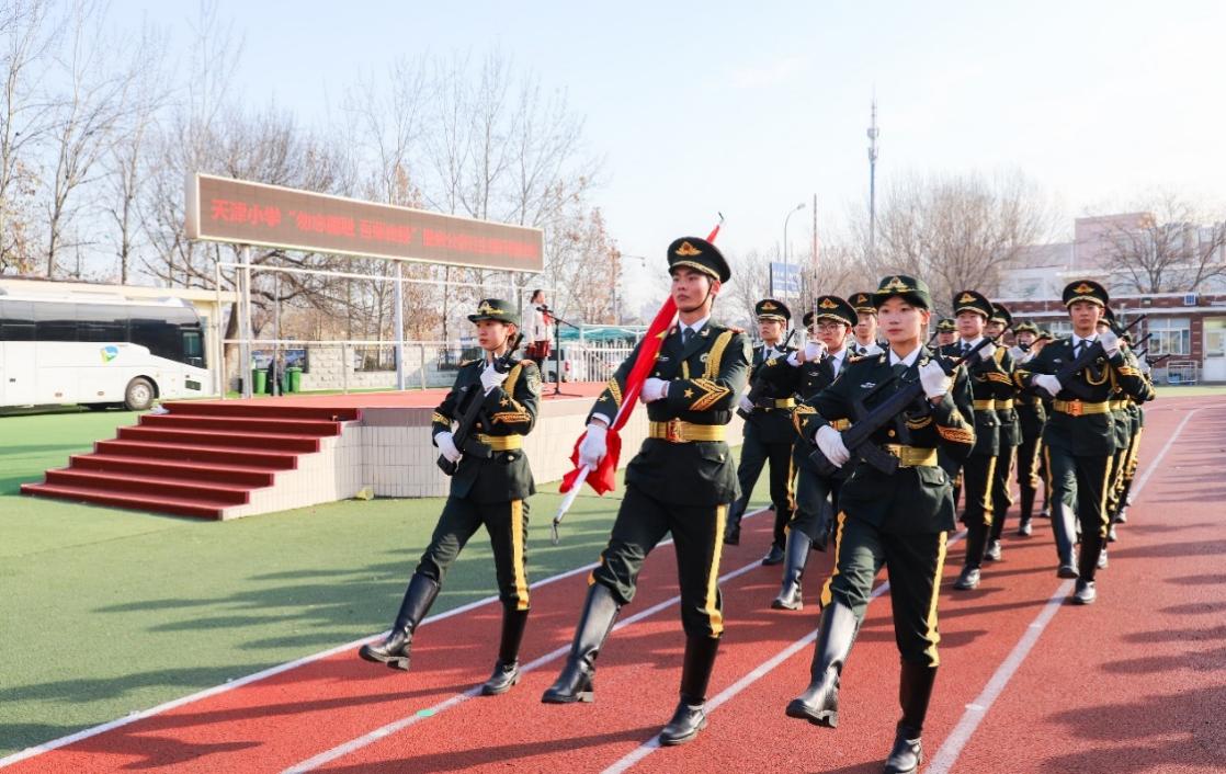 在铿锵有力的步伐声中,来自经济与管理学院的少数民族学生、退役大学生士兵和学生代表与天津小学2000余名师生一起肃立致敬,随着庄严嘹亮的《义勇军进行曲》响起,鲜艳的五星红旗在全场师生的注视下冉冉升起。