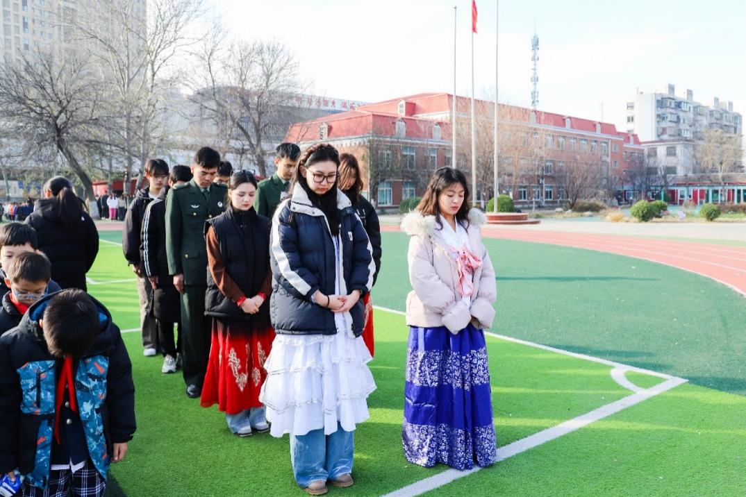 国歌唱毕,全体师生为沉痛悼念惨遭日本侵略者杀戮的死难同胞默哀,深切缅怀南京大屠杀的无辜死难者,缅怀所有惨遭日本侵略者杀戮的死难同胞,缅怀为中国人民抗日战争胜利献出生命的革命先烈和民族英雄,牢记红色历史,传承红色基因。