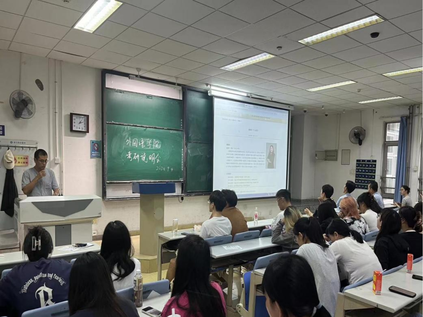 为帮助学生认清考研形势,充分调动学生考研积极性,扎实推进学院2025届毕业生考研工作,9月4日,外国语学院举行2025年考研宣讲会,外国语学院副院长王莹,英语系主任刘向东,日语系主任赵俊槐,翻译系主任郑东升出席宣讲会,学院有考研意向的2025届毕业生参加宣讲会。