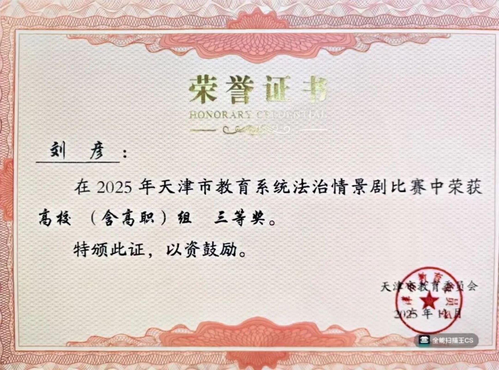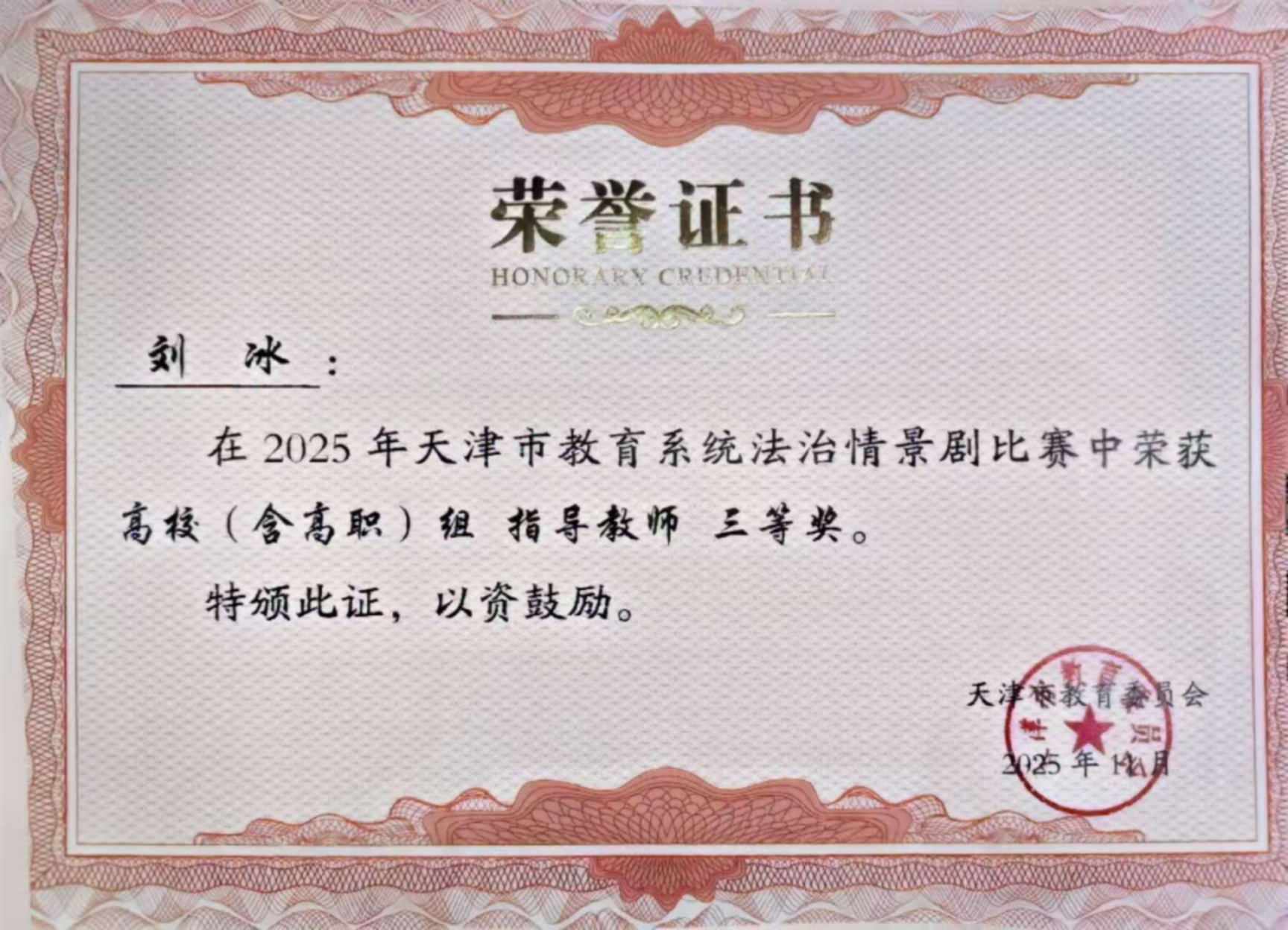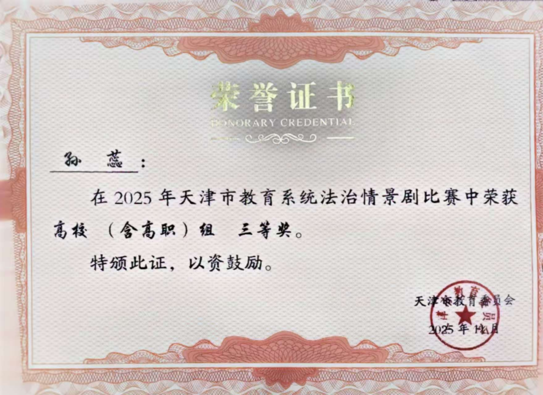 近日,2025年天津市教育系统法治情景剧比赛评选结果正式揭晓。文法学院师生团队表现出色,穆庆夏、刘冰老师荣获“高校(含高职)组指导教师三等奖”,孙蕊、贾硕、李沐涵、邵冠博、方羿程、刘彦、师晨虹、白雨纯、孙佳一九位同学荣获“高校(含高职)组三等奖”,一举斩获两项荣誉。