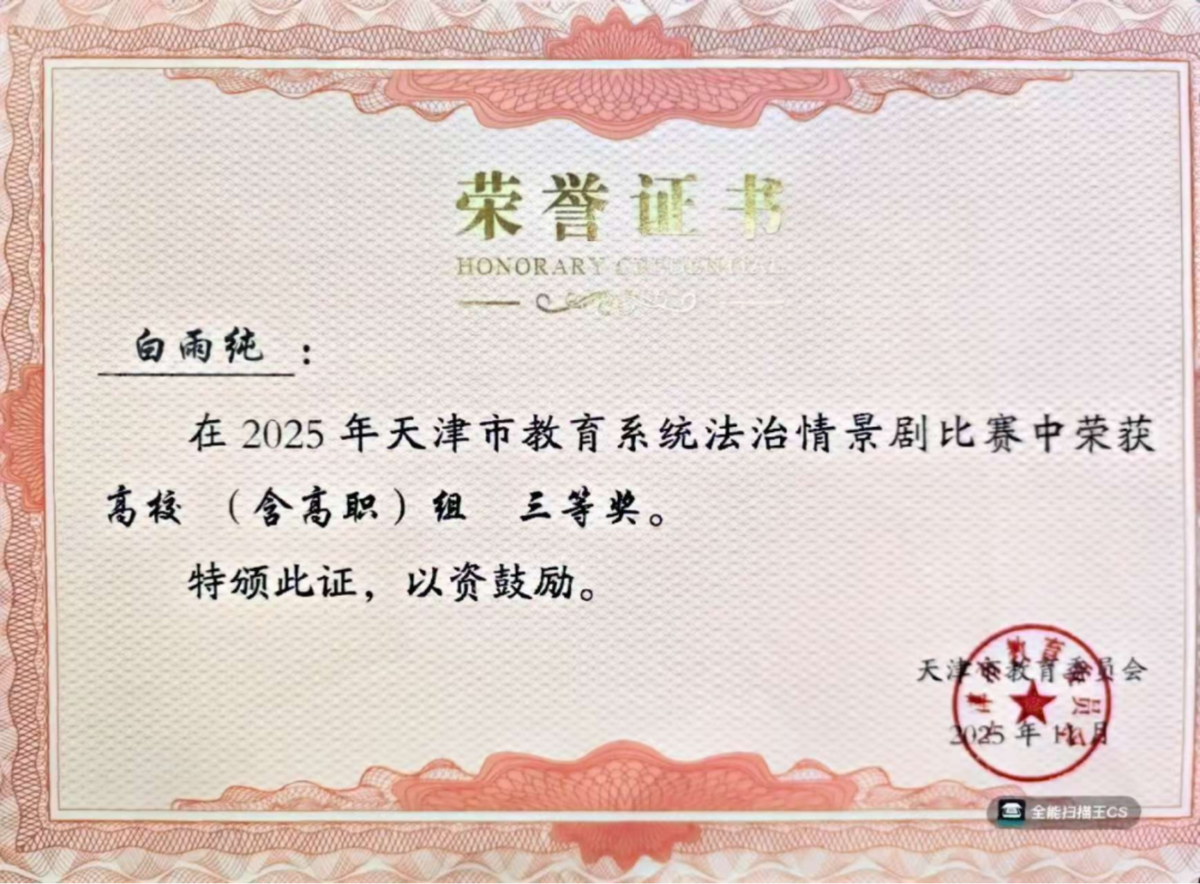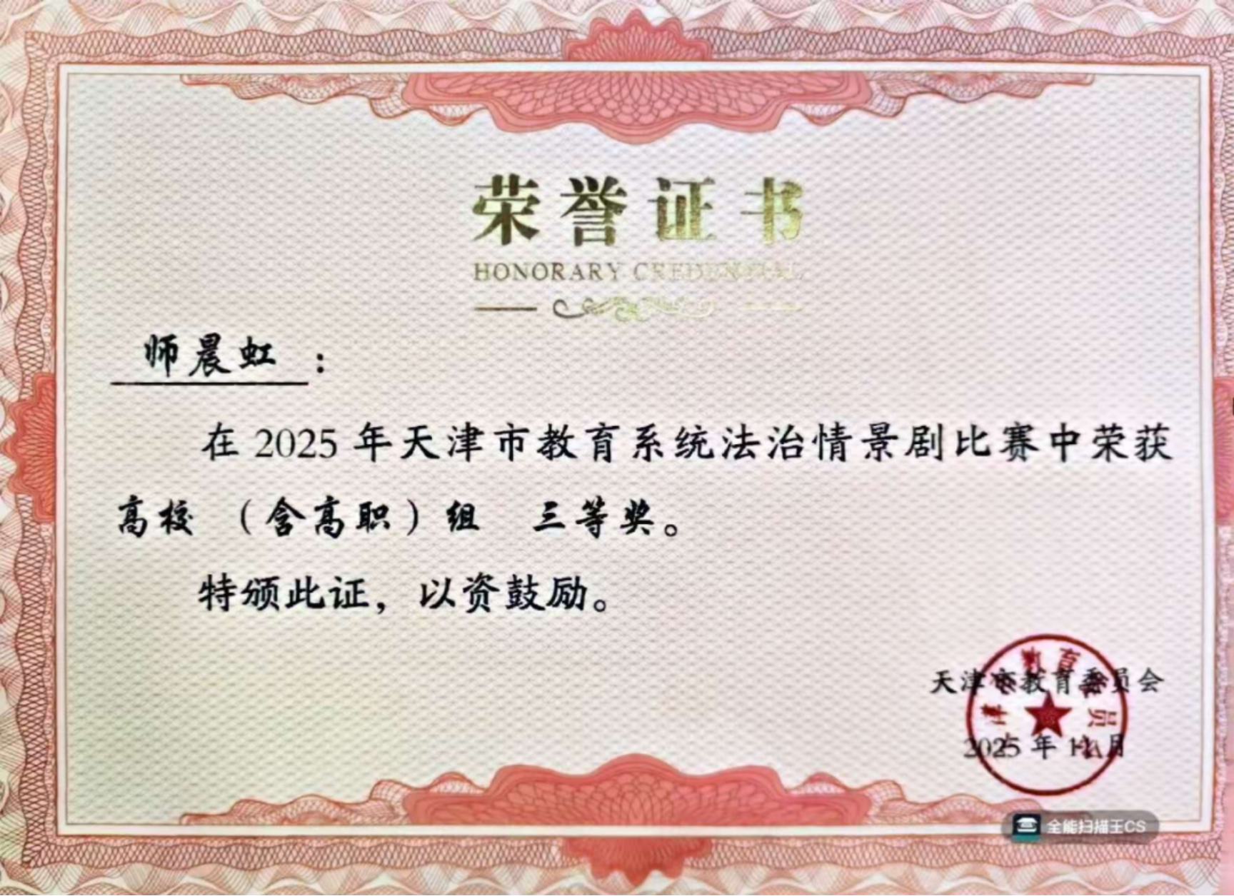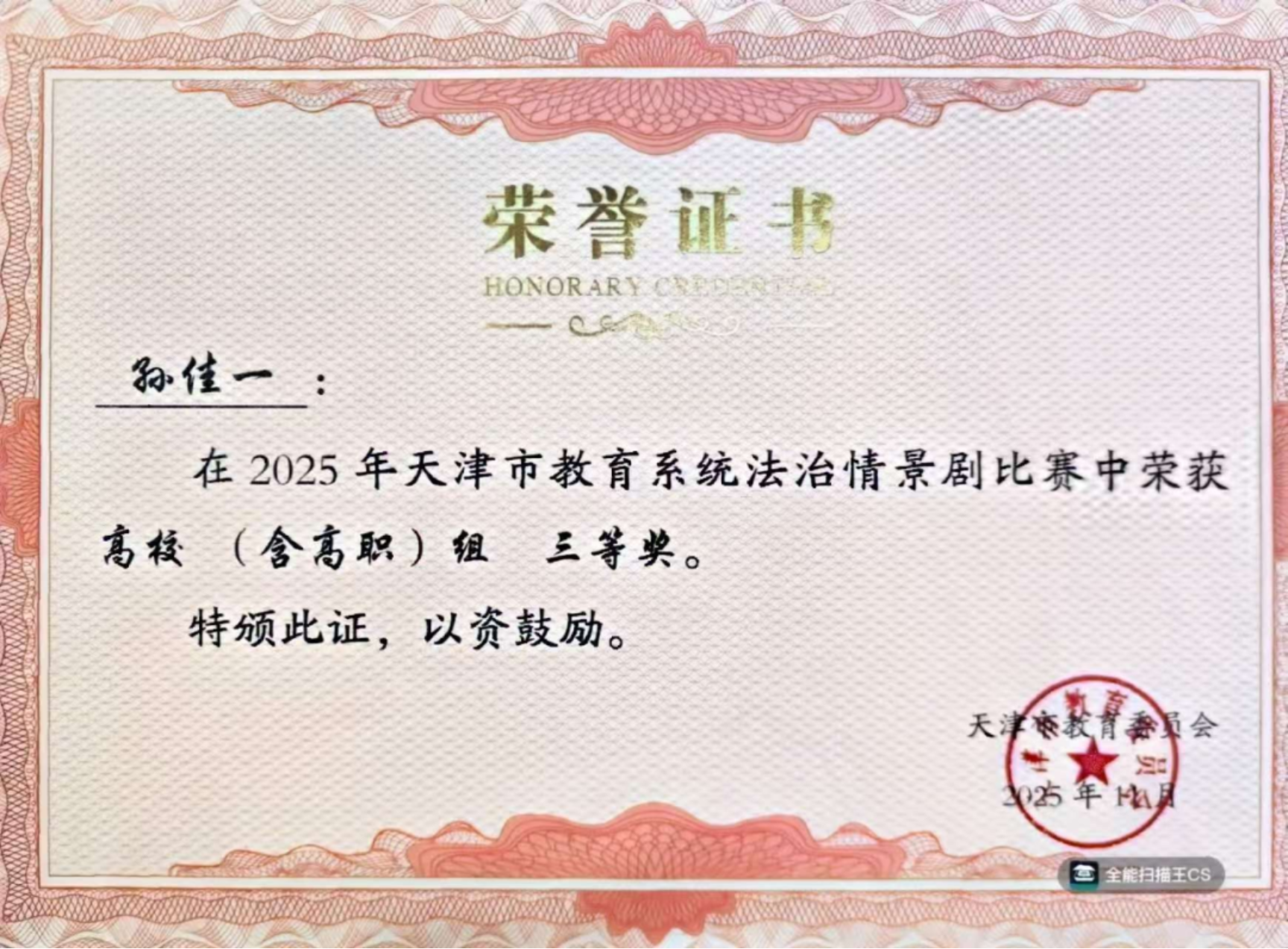 近日,2025年天津市教育系统法治情景剧比赛评选结果正式揭晓。文法学院师生团队表现出色,穆庆夏、刘冰老师荣获“高校(含高职)组指导教师三等奖”,孙蕊、贾硕、李沐涵、邵冠博、方羿程、刘彦、师晨虹、白雨纯、孙佳一九位同学荣获“高校(含高职)组三等奖”,一举斩获两项荣誉。