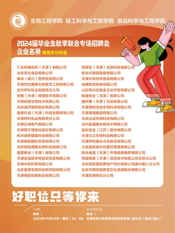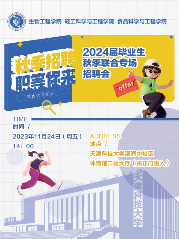 为积极响应国家人才强国战略号召,进一步拓展毕业生就业渠道、搭建优质就业平台,做好学生积极就业的有力动员和企业用人需求的有效对接,全面推动毕业生高质量就业,11月24日下午,生物工程学院联合轻工科学与工程学院、食品科学与工程学院举办的2024届毕业生秋季联合专场招聘会在滨海中校区体育馆二楼大厅举行。来自北京、天津、河北、山东、江苏、浙江、辽宁等地的40家企业参加本次招聘会。