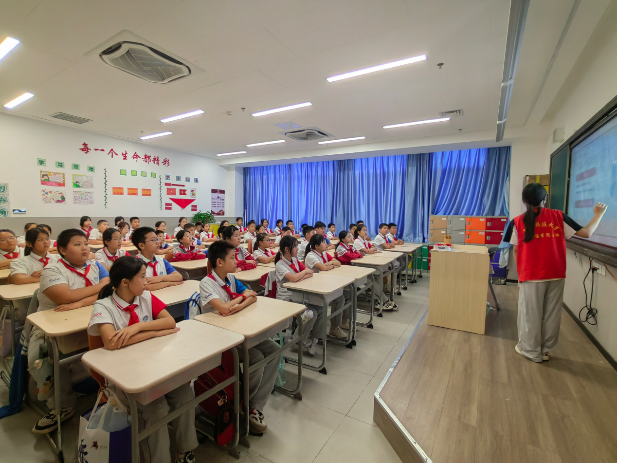 “国庆阅兵通常几年举行一次?” “在国庆阅兵中,哪个方队总是最先出场?”“国庆期间,北京有哪些著名的景点会有特别的庆祝活动或装饰?”......活动开始,外国语学院先锋实践队队员们与小学生们共同讨论国庆节的相关知识。通过提问来激发同学们的兴趣,使小学生们更加了解国庆这个节日。