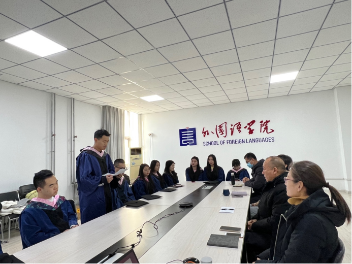 首先,外国语学院院长潮洛蒙祝贺毕业生们完成答辩,顺利毕业,并对同学们提出三点期望:第一,保持热爱。毕业以后,依然要心系专业,保持热忱。无论以后在哪个岗位,希望外语都能为我所用,给大家注入养分;第二,戒骄戒躁,继续前行。学生时代的任务虽然已经结束,但是步入社会还会有更多更大的机遇和挑战。同学们要戒骄戒躁,保持清醒的头脑。脚踏实地一步一个脚印地向前走;第三,以己度人,厚植情怀。不仅要牢记母校情怀,更要厚植国家情怀。