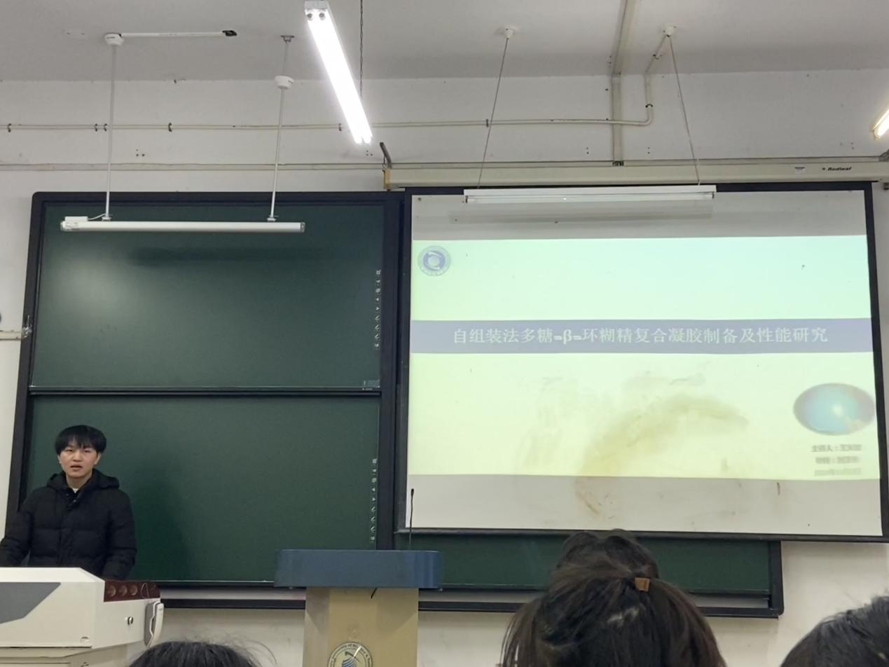 王火旺同学的主讲题目是《自组装法多糖—β—环糊精复合凝胶制备及性能研究》,主要介绍了静电自组装水凝胶,利用基本单元的特性,相互作用,达到可逆的平衡,进而形成有序结构;在物理驱动下,实现对超分子结构单元组装拆卸;静电作用前提下,组装单元为聚电解质,对于聚电解质结构和凝聚行为的研究在近几年才逐渐丰富,包括KbT热能模型,传递矩阵理论等等来预测聚电解质的凝聚行为。在天然多糖二元水凝胶的基础上引入具有独特空腔结构、多羟基、外亲水内疏水的β-环糊精(β-CD),使β-CD填充到水凝胶中形成立体复合结构,得到保水性强、强韧适中的新型结构水凝胶。