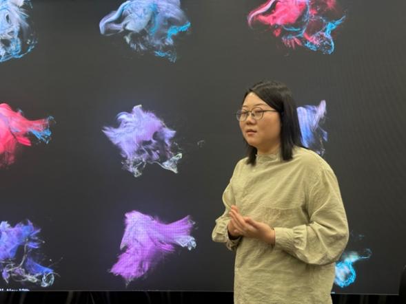 天津美术学院青年教师、数字艺术家洪昀以“触摸气候:数据、感知与生态关怀”为主题,分享了她通过提取全球近百个城市的气象数据,包括温室气体、气溶胶污染物、温度、湿度、以及地理位置等,生成了与地理位置和时间切片相对应的数字云雕塑,以沉浸式影像装置的形式呈现,展现了从数据收集、分析,再到生成与城市对应的数字云雕塑的全过程。