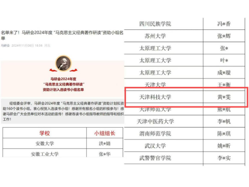 2024年11月8日,中国高等教育学会马克思主义研究分会(以下简称“马研会”)公布了2024年度“马克思主义经典著作研读”资助计划名单。由我院硕士研究生黄雅雯、刘兴国、娜迪热·麦麦提敏、李靖、罗妮妮、王乃静、茹柯耶·阿巴斯、刘晓琪、张之怡、岩温昭、杜志楷为成员的“天津科技大学攀登先锋读书小组”成功入选,并获得为期一年的读书活动资助和学习指导。