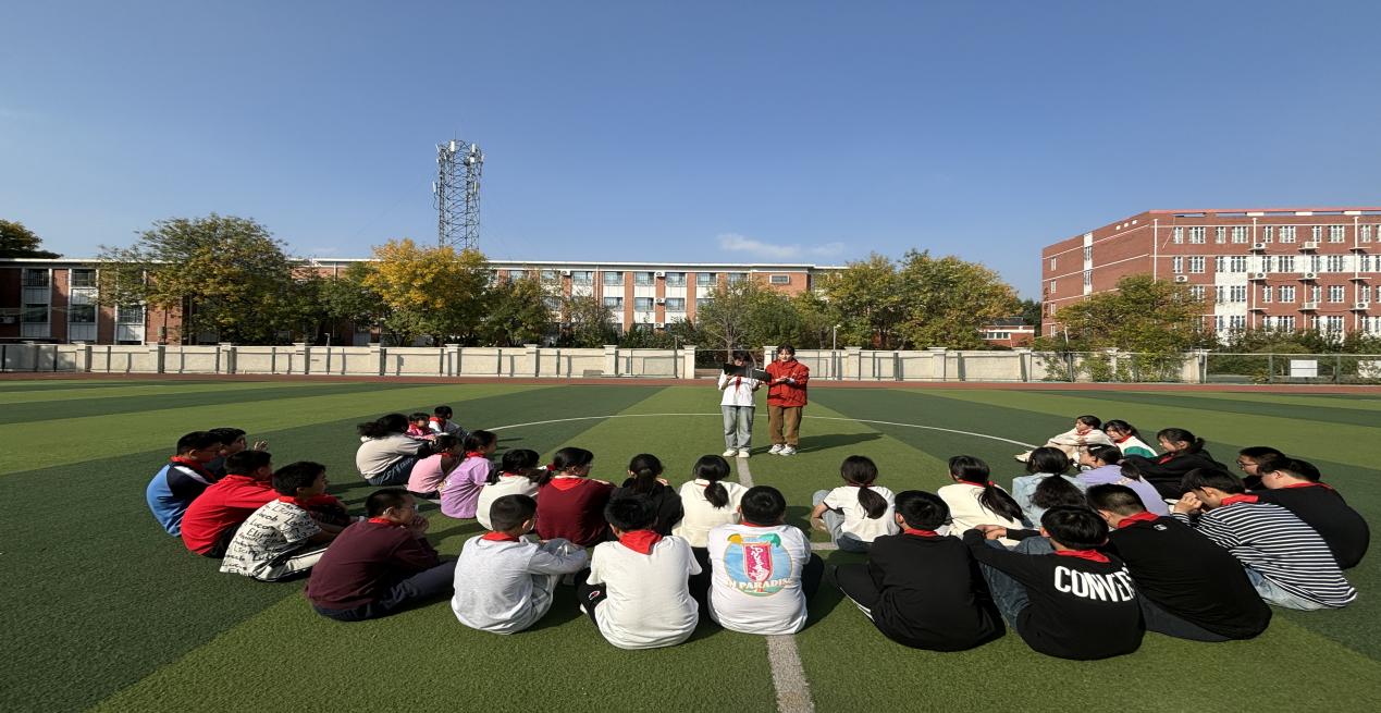 2024年10月15日下午,天津科技大学马克思主义学院第一学生社区研究生第一党支部和天津科技大学附属小学六年级学生一同在学校操场开启了一场理论宣讲与教学实践相结合的研学活动。