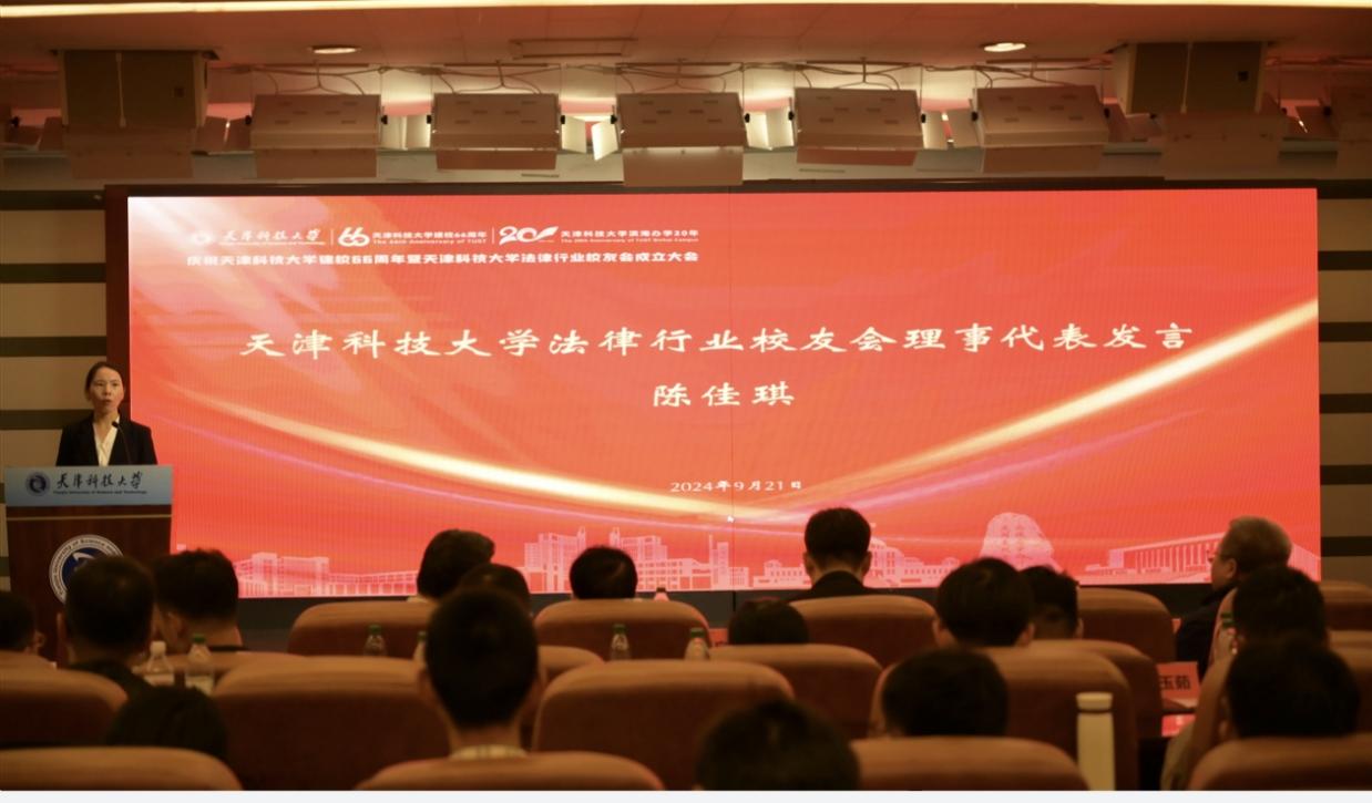 天津科技大学党委副书记贾启君出席并讲话,北京盈科(天津)律师事务所党委书记、执行主任、天津科技大学客座教授、天津科技大学律师学院高级顾问、我校校友王世清律师出席,天津东方律师事务所联合创始人、执业纪律委员会主任,天津允衡商事调解中心功能性党支部书记、主任调解员,天津科技大学律师学院执行院长、我校2003届校友侯小兵律师出席并发言。我校图书馆馆长陈蕴智、校友与基金事务发展中心副主任吴君出席。参加大会的还有天津科技大学法律行业校友会的各位校友、文法学院师生代表等。大会由文法学院党委副书记、纪委书记李霞主持。