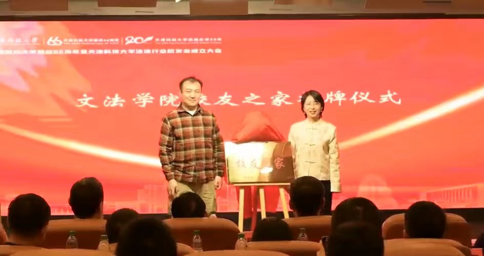 文法学院副院长王伟静代表筹备组向大会作了工作汇报,并宣读了《天津科技大学法律行业校友会章程》及第一届理事会成员名单。在热烈的掌声中,天津科技大学党委副书记贾启君和文法学院院长吴振军共同为“天津科技大学法律行业校友会”揭牌。