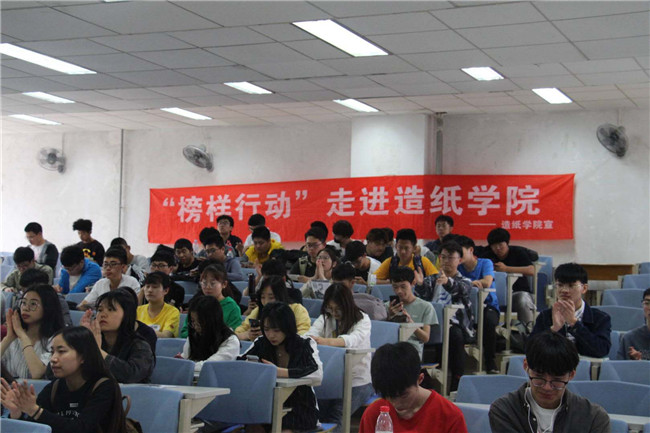 为帮助同学们确立学习目标,勇于面对生活中的困难,造纸学院于五月八日中午十二点半在图书馆十五阶举行了"榜样活动"巡讲活动。活动由经管学院王艺颖学姐,造纸学院张佳音学姐,外国语学院刘会芳学姐和计算机学院李政学长分别分享各自独特的学习经验和成长心得,18级造纸一班丁文鹏同学主持,大一大二的全体同学参加。