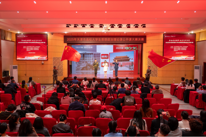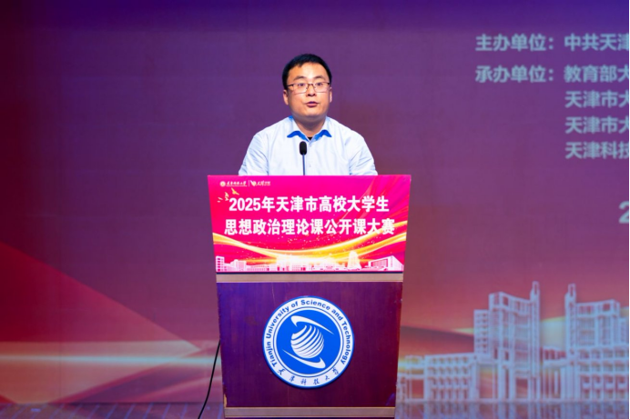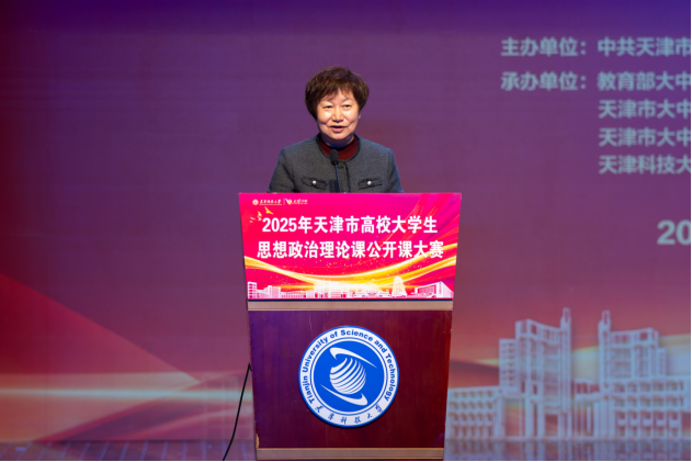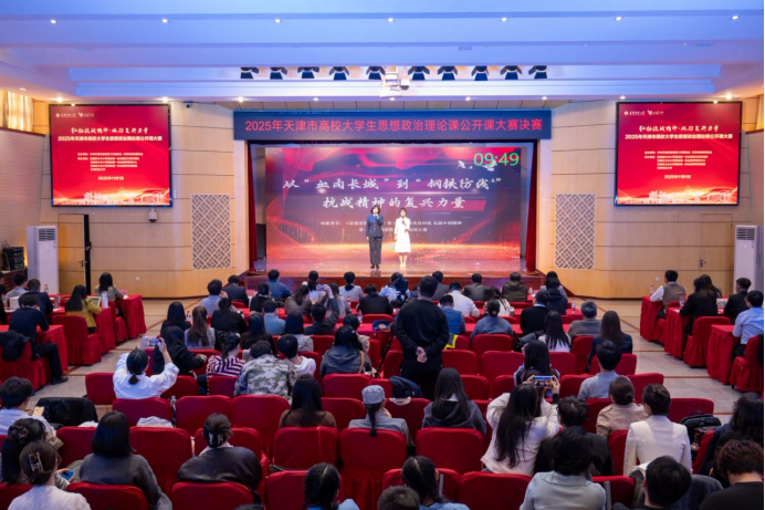 为纪念中国人民抗日战争胜利80周年,深入学习贯彻落实习近平总书记关于弘扬伟大抗战精神的重要论述,引导广大青年学子在历史回望中坚定理想信念,在精神传承中汲取奋进力量,11月1日下午,由天津市教育两委主办,教育部大中小学思政课一体化建设天津共同体、天津市大中小学思政课一体化教学研究中心、天津市大中小学思政课一体化教学研究联盟、天津科技大学共同承办的“弘扬抗战精神·砥砺复兴力量”2025年天津市高校大学生思想政治理论课公开课大赛(本科院校组)决赛在天津科技大学顺利举行。天津市各高校马克思主义学院教师及学生代表200余人观看了比赛。