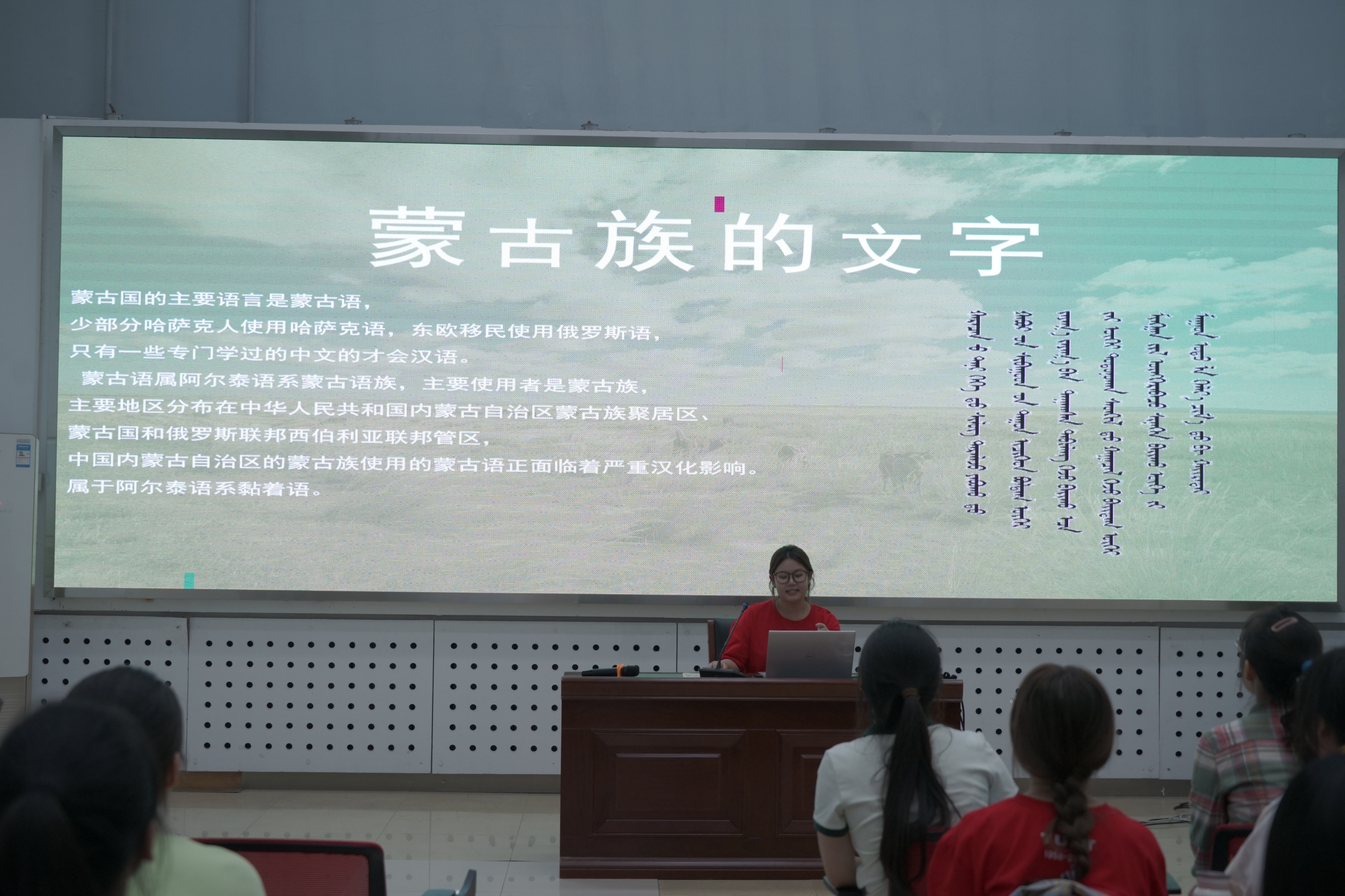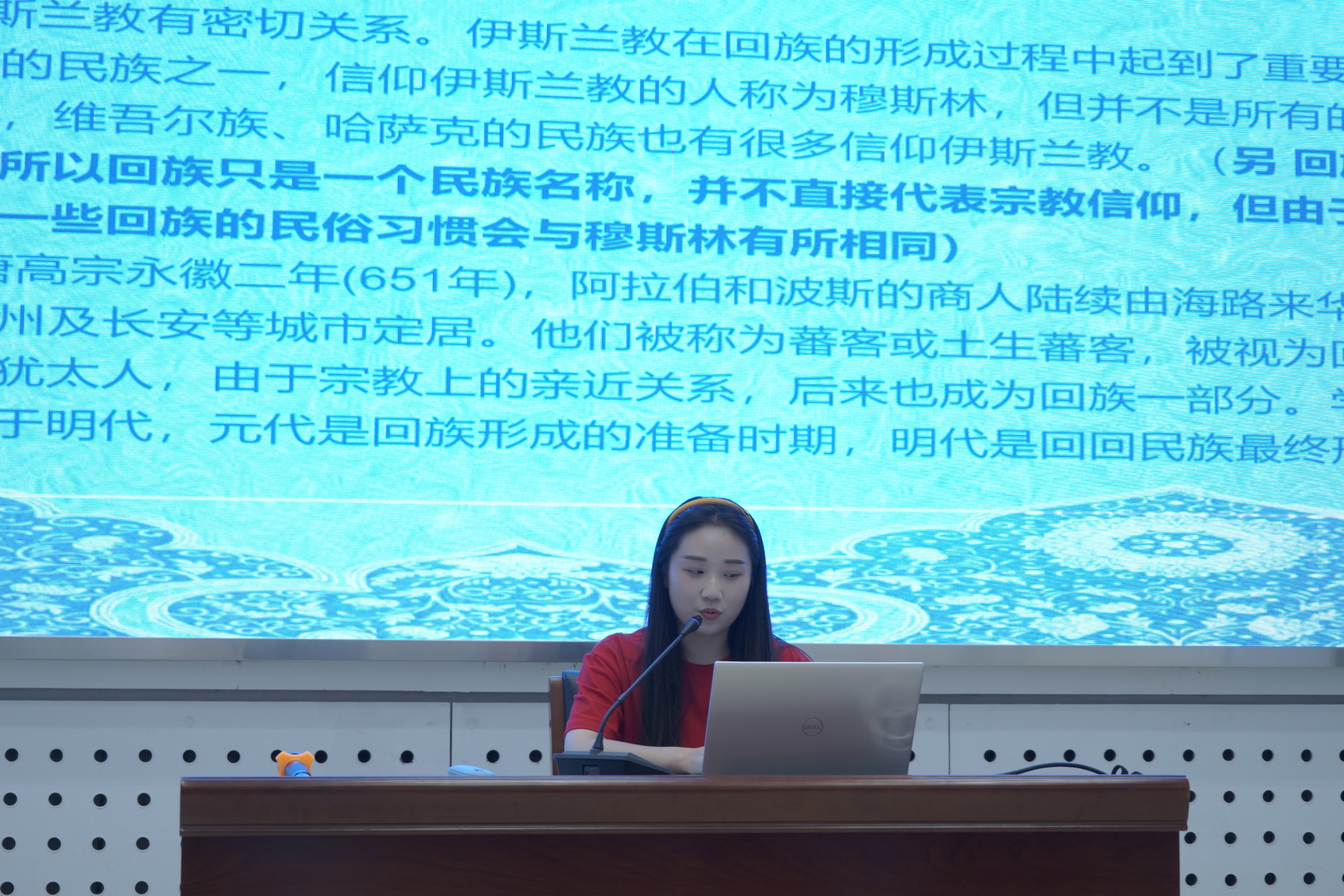 来自蒙古族、回族、壮族、傣族、维吾尔族等少数民族同学和汉族同学代表向大家介绍了自己的民族特色、风俗习惯、文化传统等。蒙古族长调的意蕴、回族衣饰的华丽、壮族歌谣的优美、傣族泼水节的风情,维吾尔族美食的诱人、汉族风俗的多样,大家的介绍让同学们了解了各民族的文化底蕴和独特的民族风情。