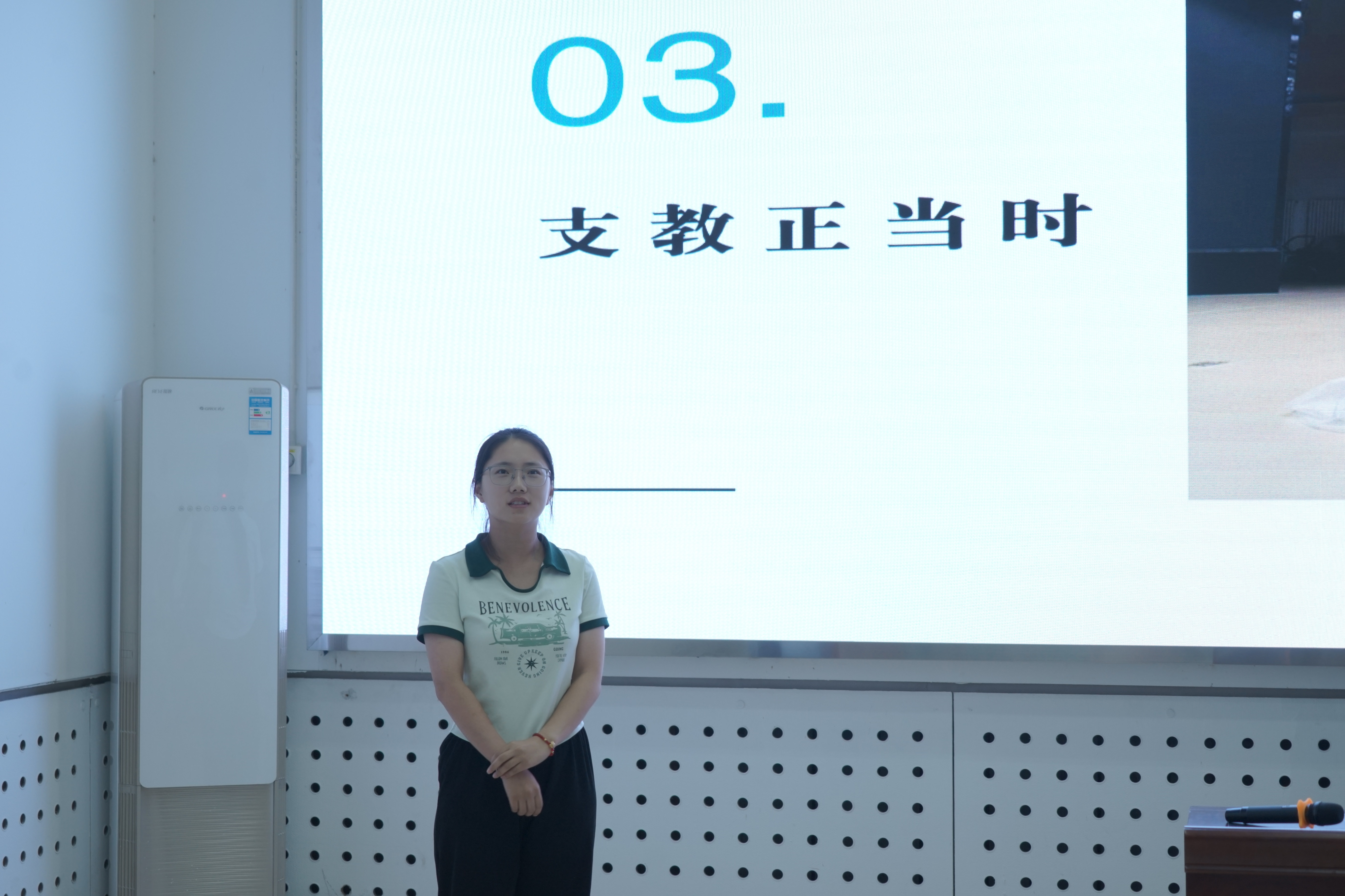 主题班会上,徐蓉同学和张美玉同学向大家介绍了自己作为研究生支教团成员的援疆支教经历。徐蓉同学着重介绍了在国家政策助力下边疆地区人民生活新面貌,张美玉同学重点展示了在支教过程中同当地师生结下的深情厚谊。