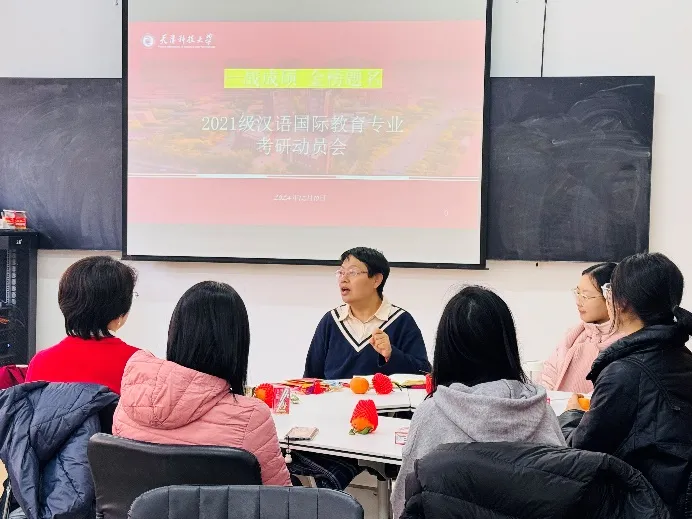 在2025年全国硕士研究生招生考试即将来临之际,为帮助毕业班考研学生舒缓压力、增强信心,文法学院汉语国际教育系于12月10日在2-312实训室开展2025届考研学生慰问活动。学院党委张艳秋书记、张海涛副院长莅临活动现场。汉教系柴红梅、何国锦老师共同参加活动。活动由系主任赵林晓老师主持。