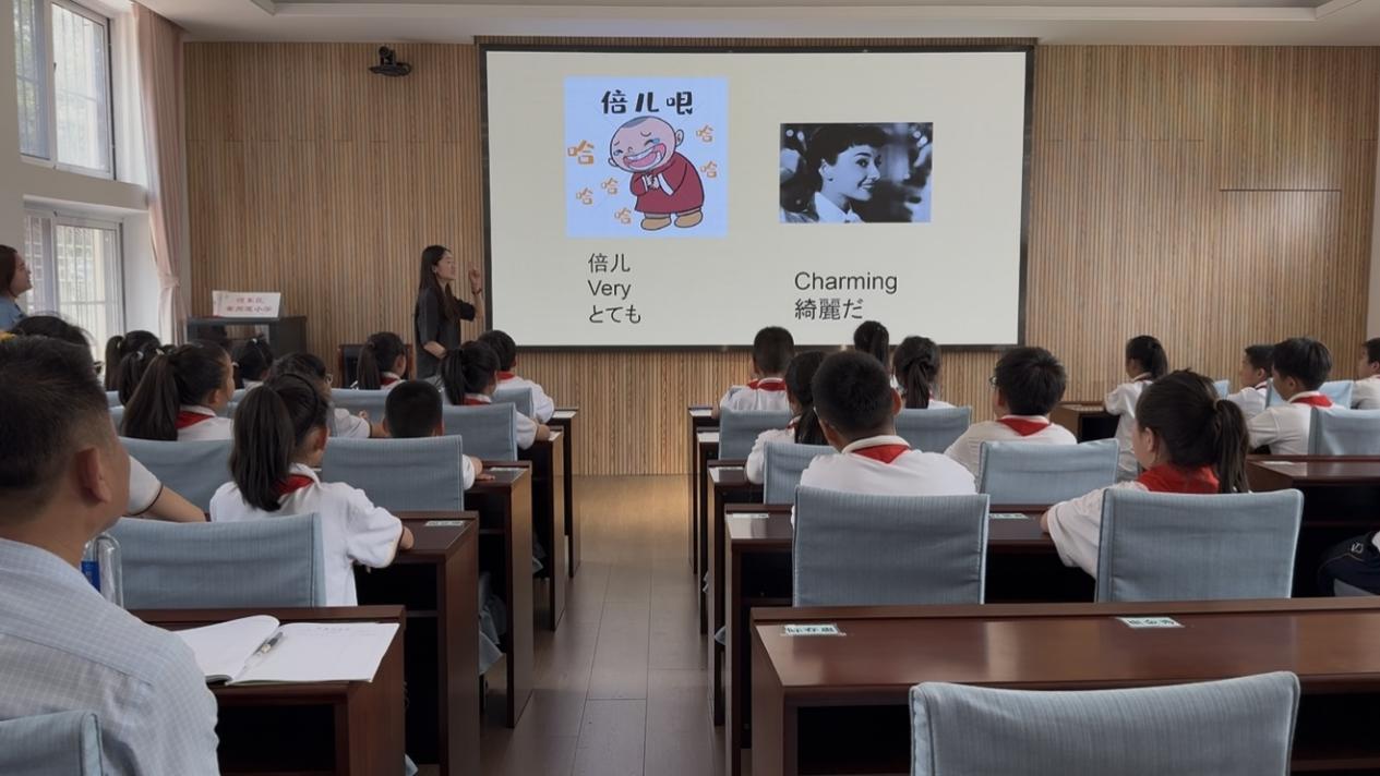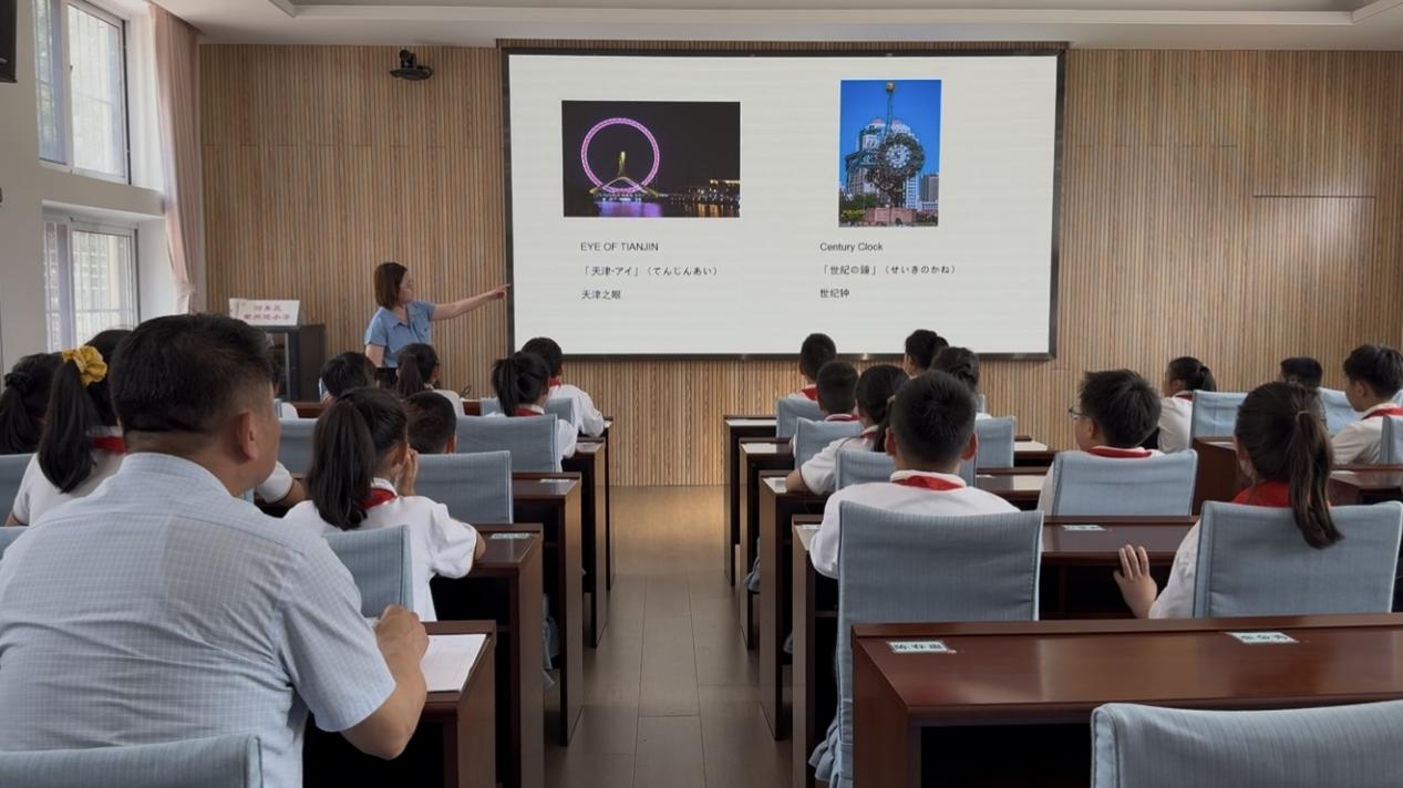 活动以“活态文化解码”为主线,开篇便用一段光影流转的天津城市宣传片抓住了孩子们的目光:解放桥的钢铁弧度、五大道的洋楼风情、古文化街的红灯笼影…… 画面定格处,实践团成员笑着提问:“这些美景用英语怎么说?日语里又藏着怎样的表达?”一场本土文化与国际语言的对话,就此拉开序幕。