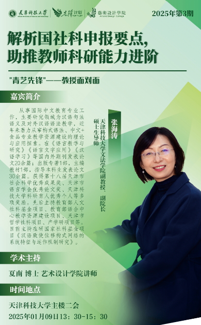 1月9日下午,“解析国社科申报要点,助推教师科研能力进阶”学术沙龙于天津科技大学河西校区主楼第二会议室由艺术设计学院青艺先锋成功举办。本次活动特邀文法学院副院长张海涛副教授担任主讲嘉宾,青年教师夏南担任主持人,副院长仓诗建出席。此次活动吸引了众多教师参与,尤其是40岁及以下青年教师积极响应。