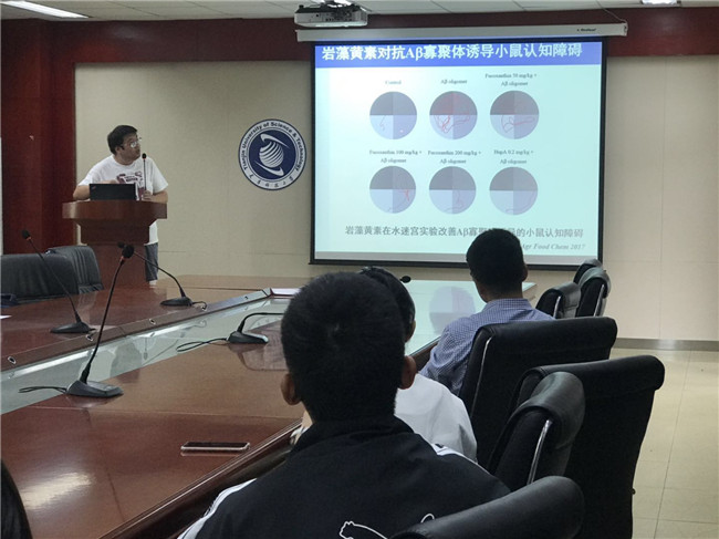 崔巍博士现为宁波大学医学院副教授,主要研究方向为神经退行性疾病病理机制和药物开发,尤其关注海洋天然产物神经精神活性和新药研发。崔巍博士本次作"研发抗神经退行性疾病海洋药物"的报告。从神经退行性疾病共有机制及海洋药物的优势入手,和听众分享了海洋天然产物库筛选靶向Aβ候选化合物、多靶点对抗AD的海洋明星分子发现和改造等多个故事。报告后,崔巍博士与我校师生针对报告进行了深入的交流。