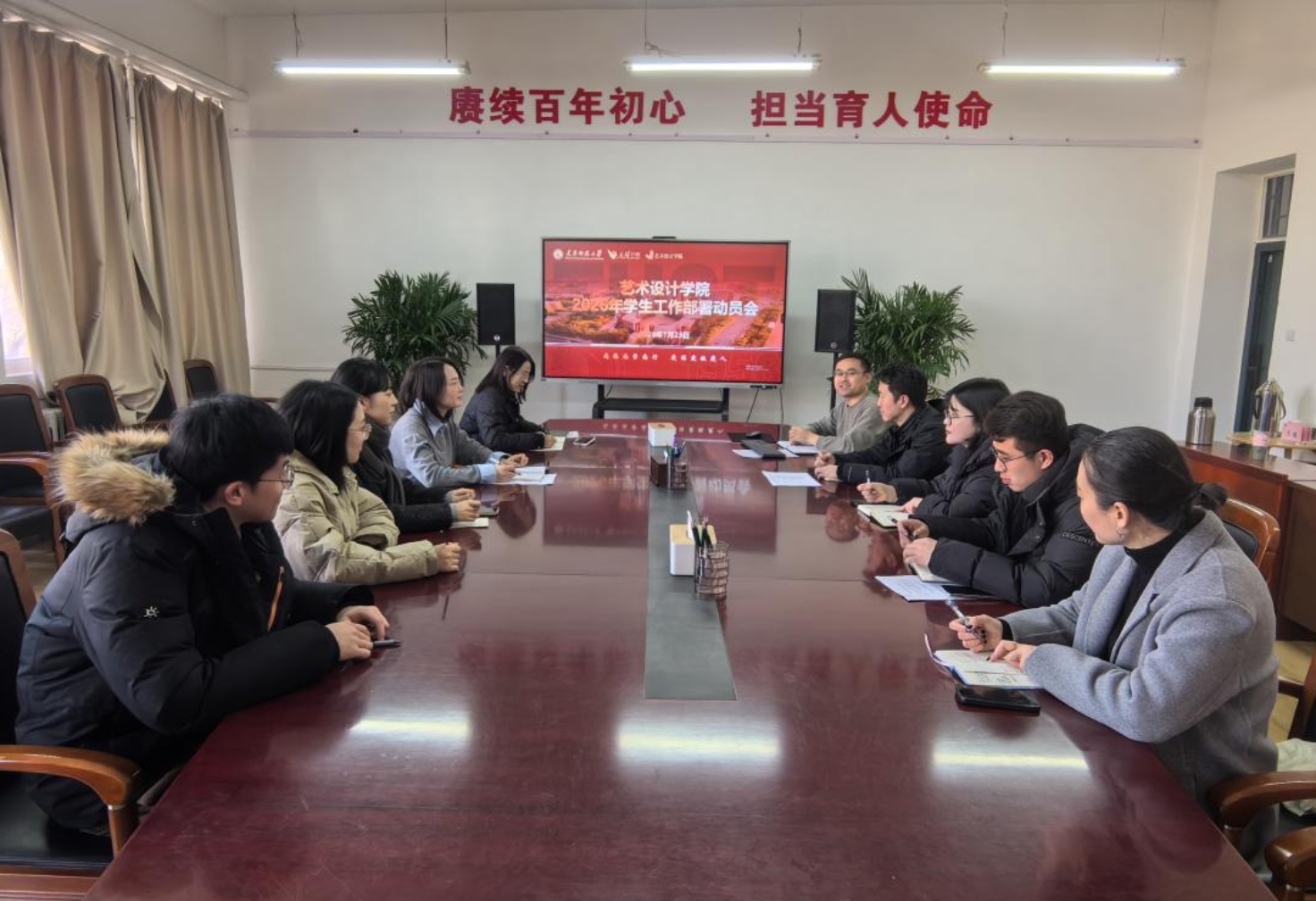 为深入贯彻学校“先锋计划”部署要求,扎实推进“3510”战略工程落地见效,进一步明确年度工作方向、凝聚育人合力,1月23日,艺术设计学院召开2026年学生工作部署动员会。会议由学院团委书记、学工办主任易晓俊主持,学院党委副书记范爱春、全体辅导员参加会议。