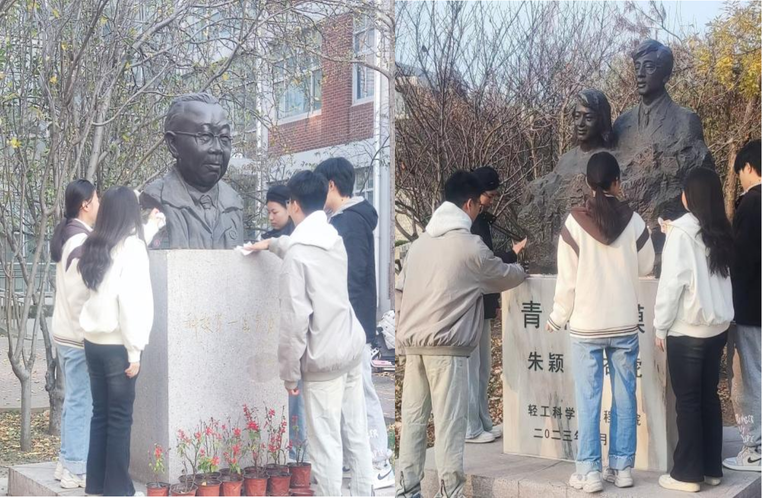 活动尾声,支部全体党员怀着崇敬之情,细心清扫了朱颖、许杏虎烈士以及隆言泉教授的铜像,拂去尘埃,让红色象征更加庄严、肃穆,让朱颖精神与隆言泉教育家精神在天科校园内熠熠生辉,时刻激励着广大师生前行。