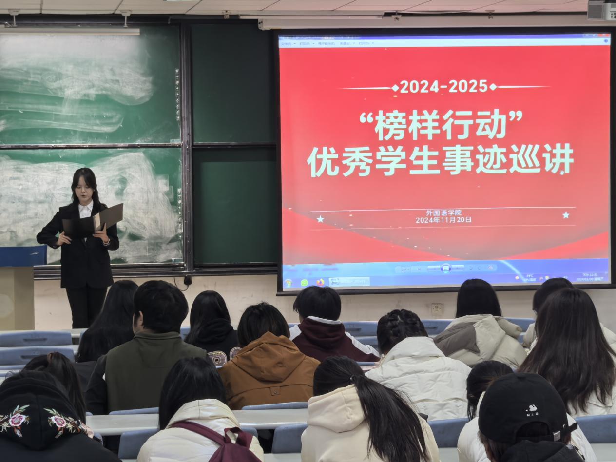 为深入学习贯彻习近平新时代中国特色社会主义思想和党的二十大精神,充分发挥先进典型示范引领作用,持续讲好榜样故事,把榜样力量转化为生动实践,外国语学院于2024年11月20日第二阶梯教室举办了“先锋领航 筑梦未来”外国语学院“榜样行动”优秀学生事迹系列巡讲第二场。2023级翻译专业及日语专业的43班、44班参加此次活动,宣讲会由丁紫妍、侯颖思、彭煜轩三名巡讲团成员主讲。