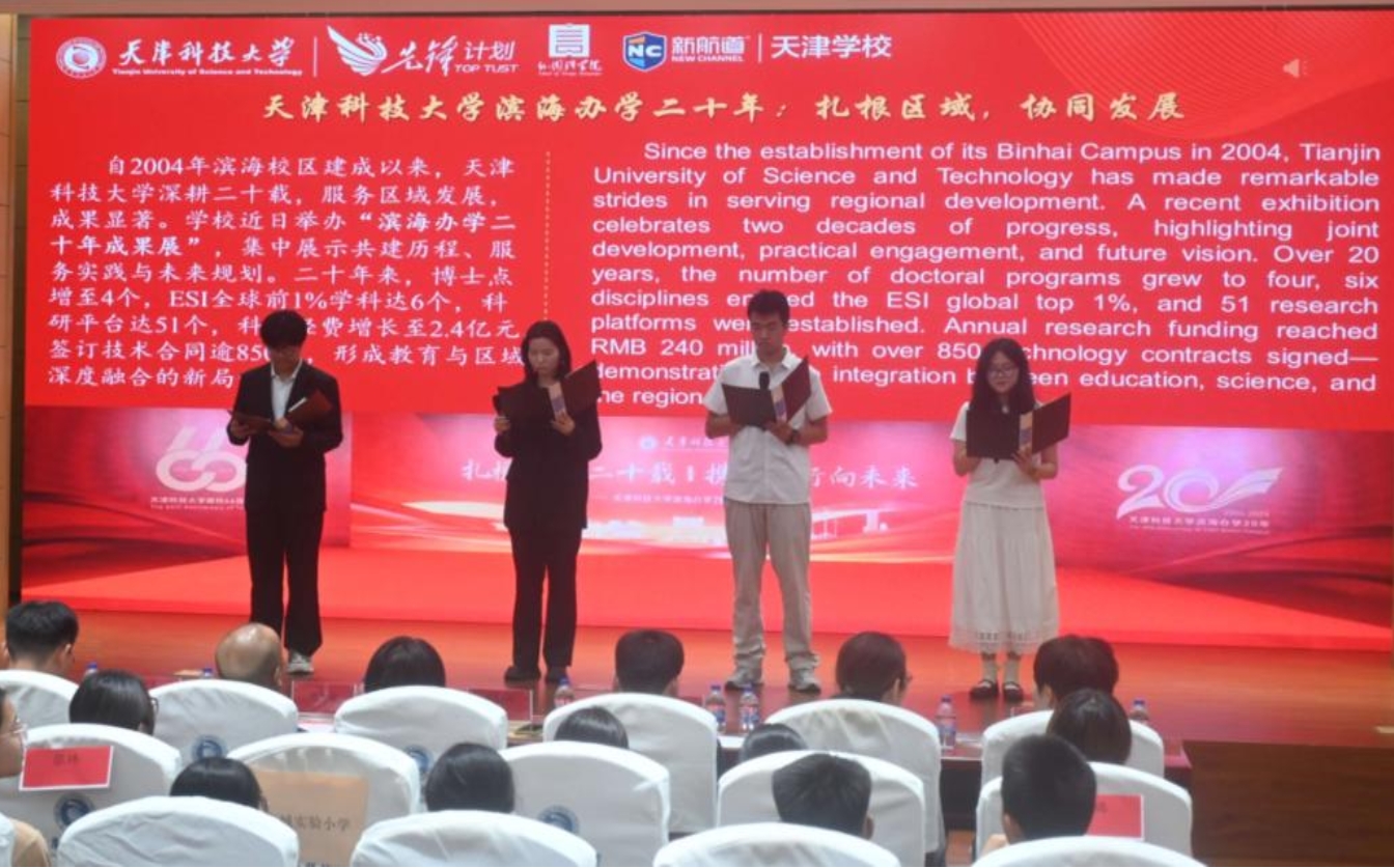节目展演中,来自外国语学院的汪烨、刘杨柳青、林少华和生物学院的胡濯然以《TUST办学20周年成果展》为主题带来外文朗诵,将学校扎根滨海二十载取得的各项成就,化作一句句掷地有声的表达,带领听众与学校发展同频共振,感受先锋精神;外国语学院的胡彭美琳与文法学院的邵乐乐进行《白雪公主》配音展示,用灵动的声音塑造角色,展现出扎实的外语功底;外文金曲串烧《我的梦+Undo》成为文化交融的旋律舞台,韦秋霞用歌声搭建起中外音乐的桥梁;日语演讲《PRC》让中国故事有了新的叙事视角,“中国故事如何用外语讲得动人”,胡云同学给出了青春的答案;生态城实验小学与科大学子携手登台讲述《中国扎染技术——永恒的文化瑰宝》,用英语解码中国扎染的非遗密码,实现了国际表达与非遗魅力的完美融合。